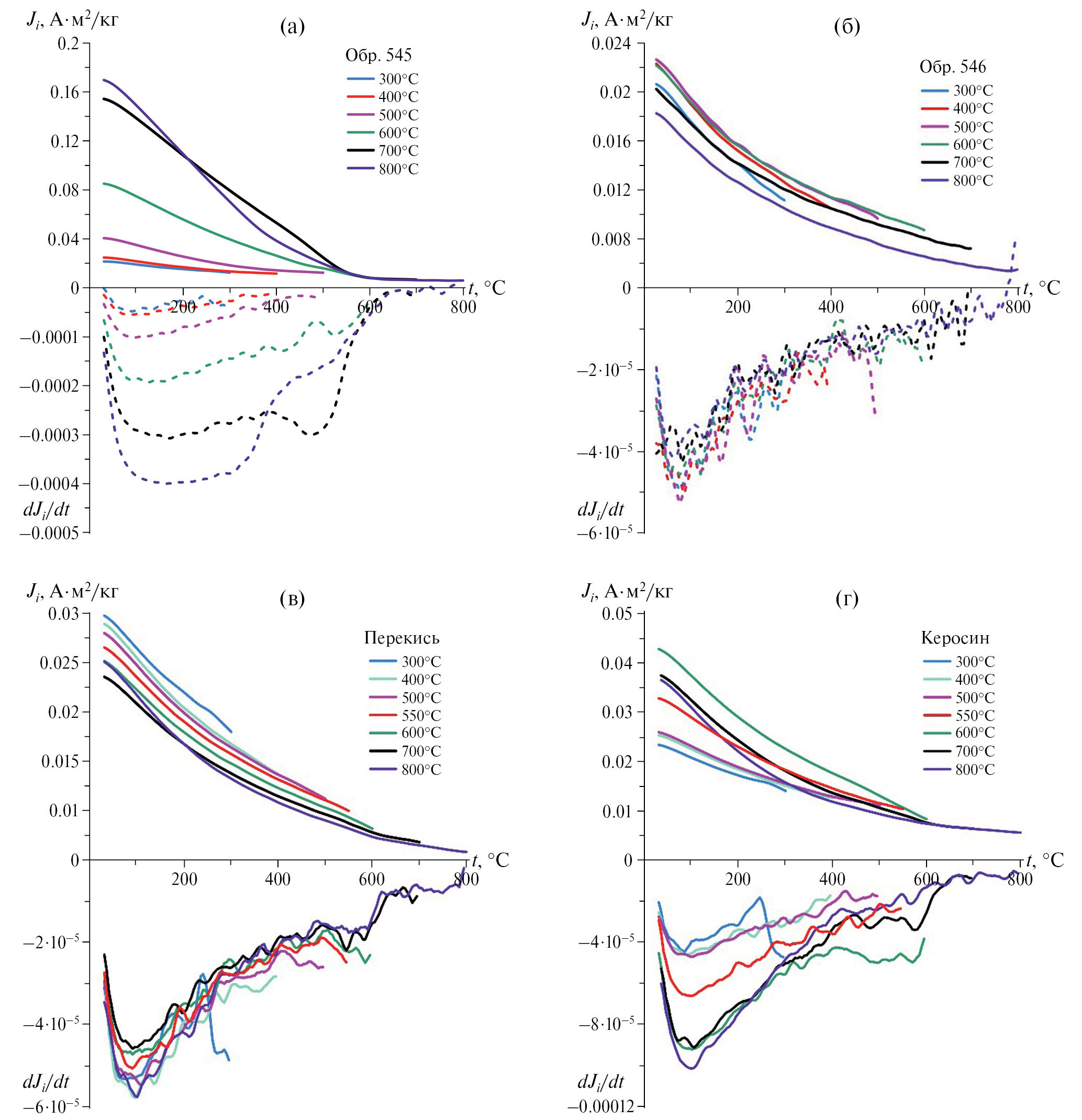 Рис. 5. Термомагнитные кривые: (а) – образец 545 (90 см); (б) – образец 546 (92 см) после травления органики (исходное состояние); (в) – обработка перекисью водорода; (г) – обработка керосином.