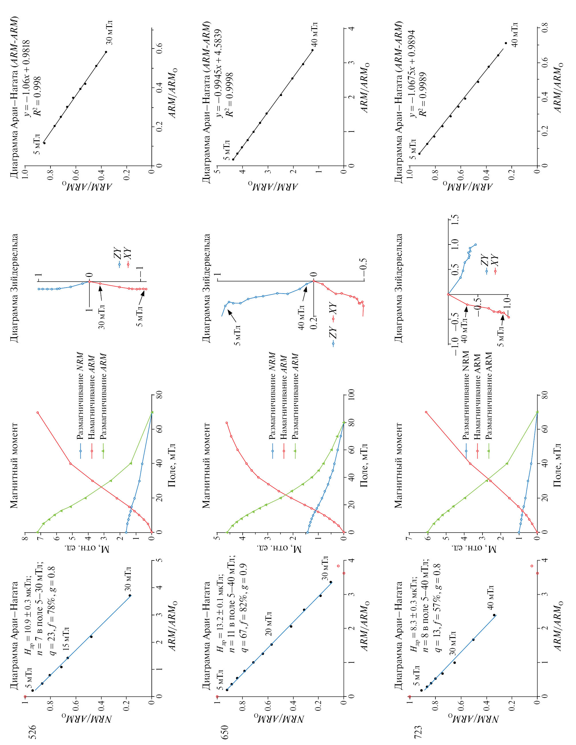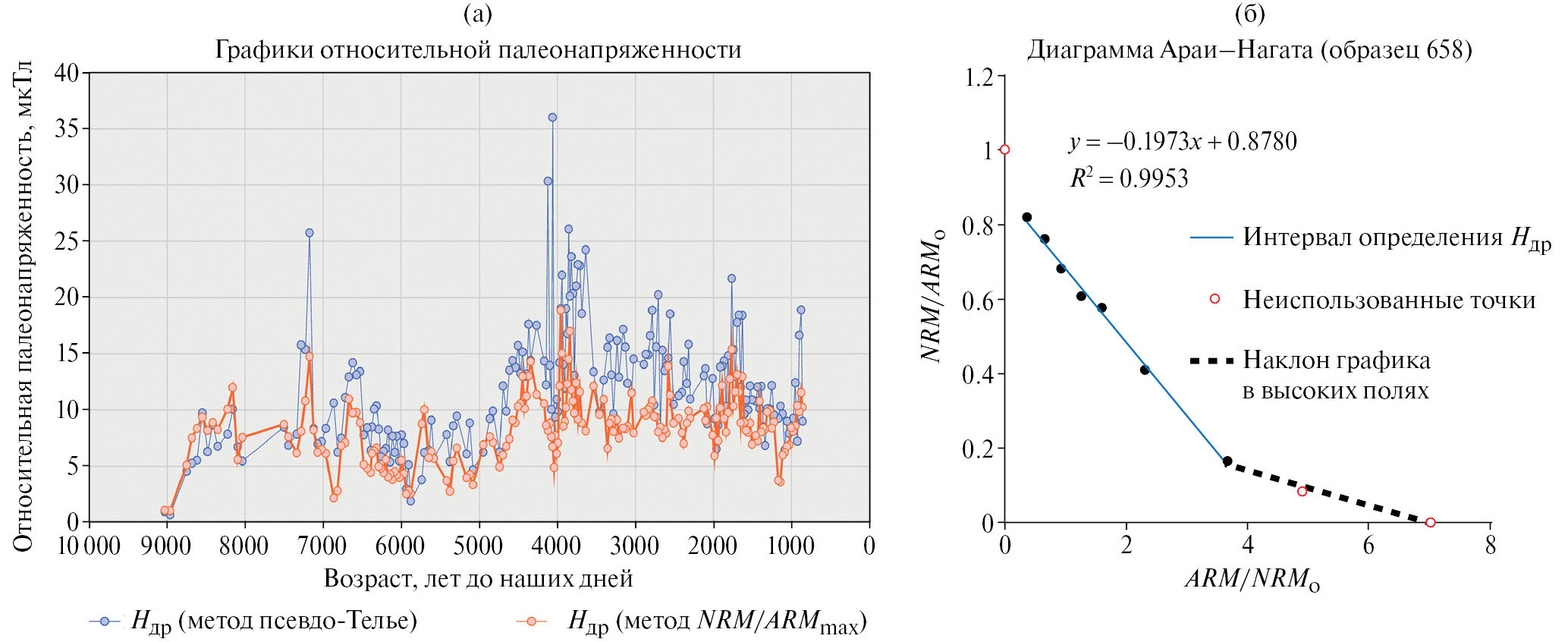 Результаты Ндр полученные по отношению NRM/ARMmax×50 мкТл, схожи между собой, коэффициент корреляции составляет 0.69 (рис. 8). Однако первые данные систематически ниже, чем вторые, что вероятно связано с выполаживанием графика NRM/ARM на диаграмме Араи–Нагаты в высоких полях (рис. 8б) и, соответственно, с увеличением доли ARM в сравнении с NRM.