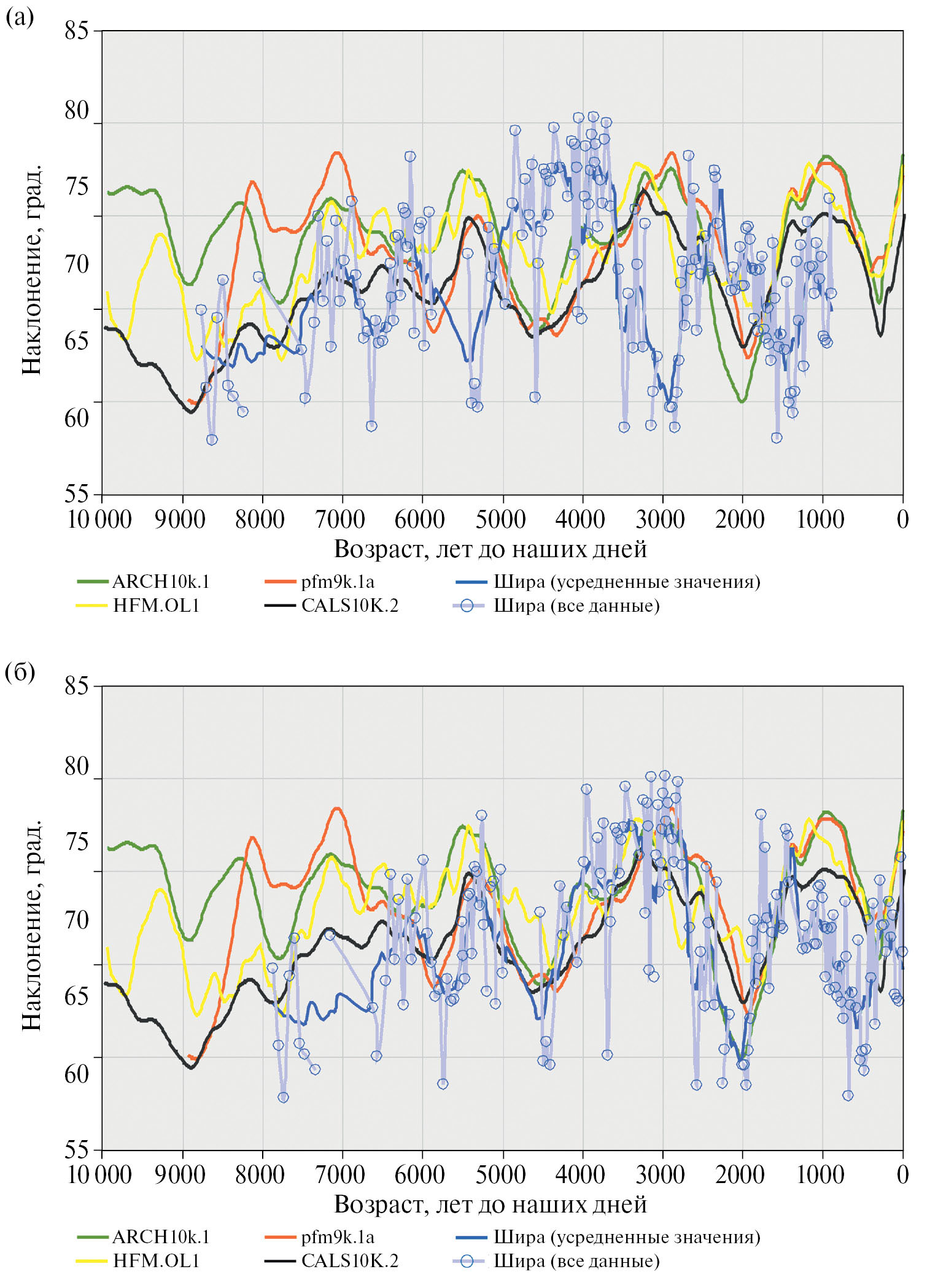 Хорошее согласие между различными моделями обосновано, очевидно, тем, что во всех моделях используется один и тот же набор данных, полученных непосредственно для региона вокруг оз. Шира. Как результат, указанные модели практически полностью повторяют археомагнитные данные по Сибири и Монголии, отобранные с территории, близкой к оз. Шира (координаты 46–57° с.ш. и 102–115° в.д.) [Бурлацкая, 1970; Бурлацкая и др., 1976; Начасова, Бураков, 1997a; 1997б; Бураков и др., 2000; Начасова, Бураков, 2008; Начасова и др., 2015] (рис. 10).