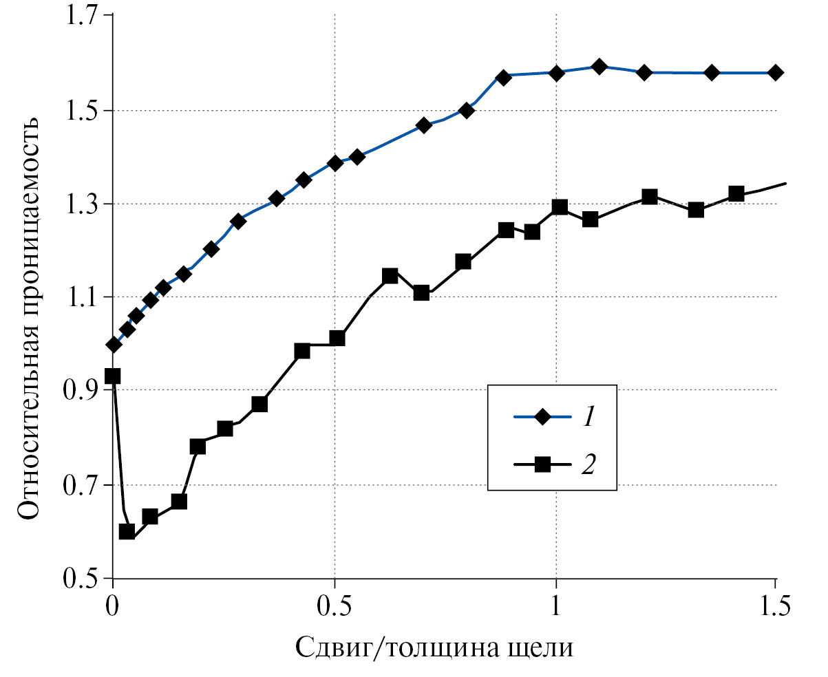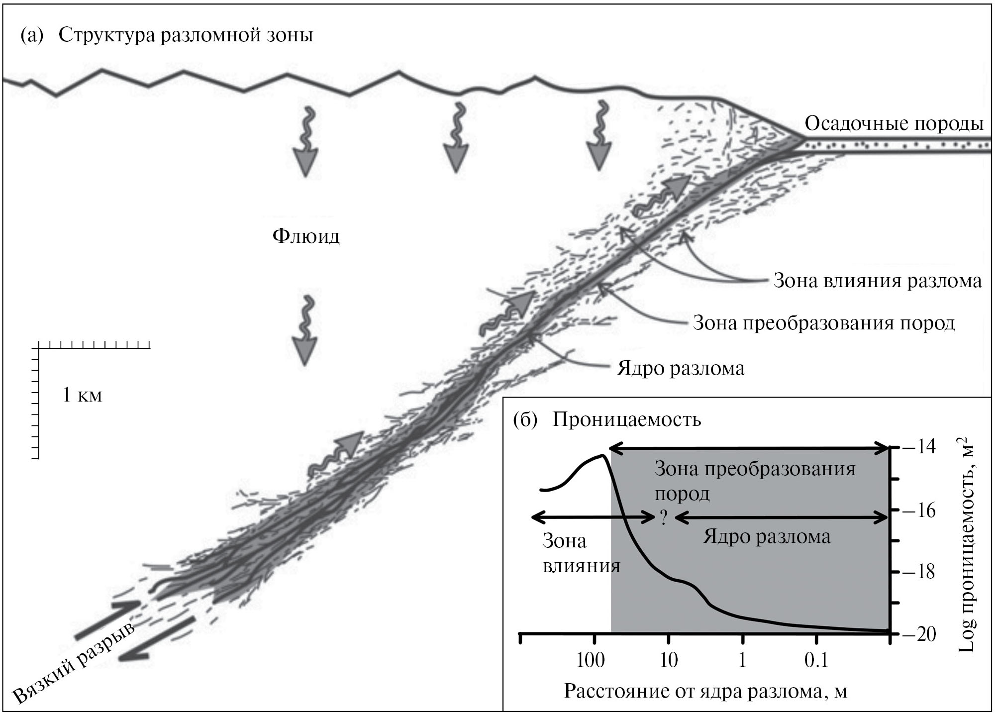 В целом, картина повышения проницаемости в зоне влияния разлома по сравнению с протолитом и резкое ее снижение в ядре разлома, является типичной, см., например, врезку на рис. 2 [Sutherland et al., 2012].