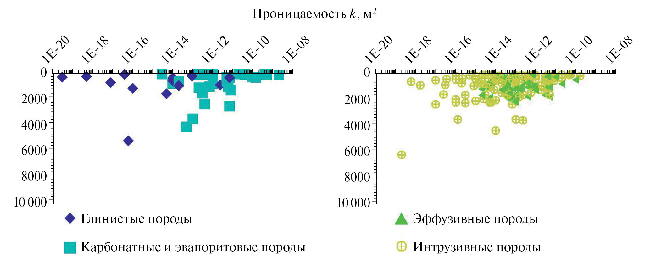 При проведении сравнения проницаемости пород, залегающих в приповерхностных условиях, выделяются два облака точек, характерных для глинистых и для карбонатных пород. Значения проницаемости глинистых пород группируются в интервале от 10–20 до 10–12 м2, тогда как характерные значения для проницаемости карбонатных пород варьируются в интервале от 10–14 до 10–8 м2.