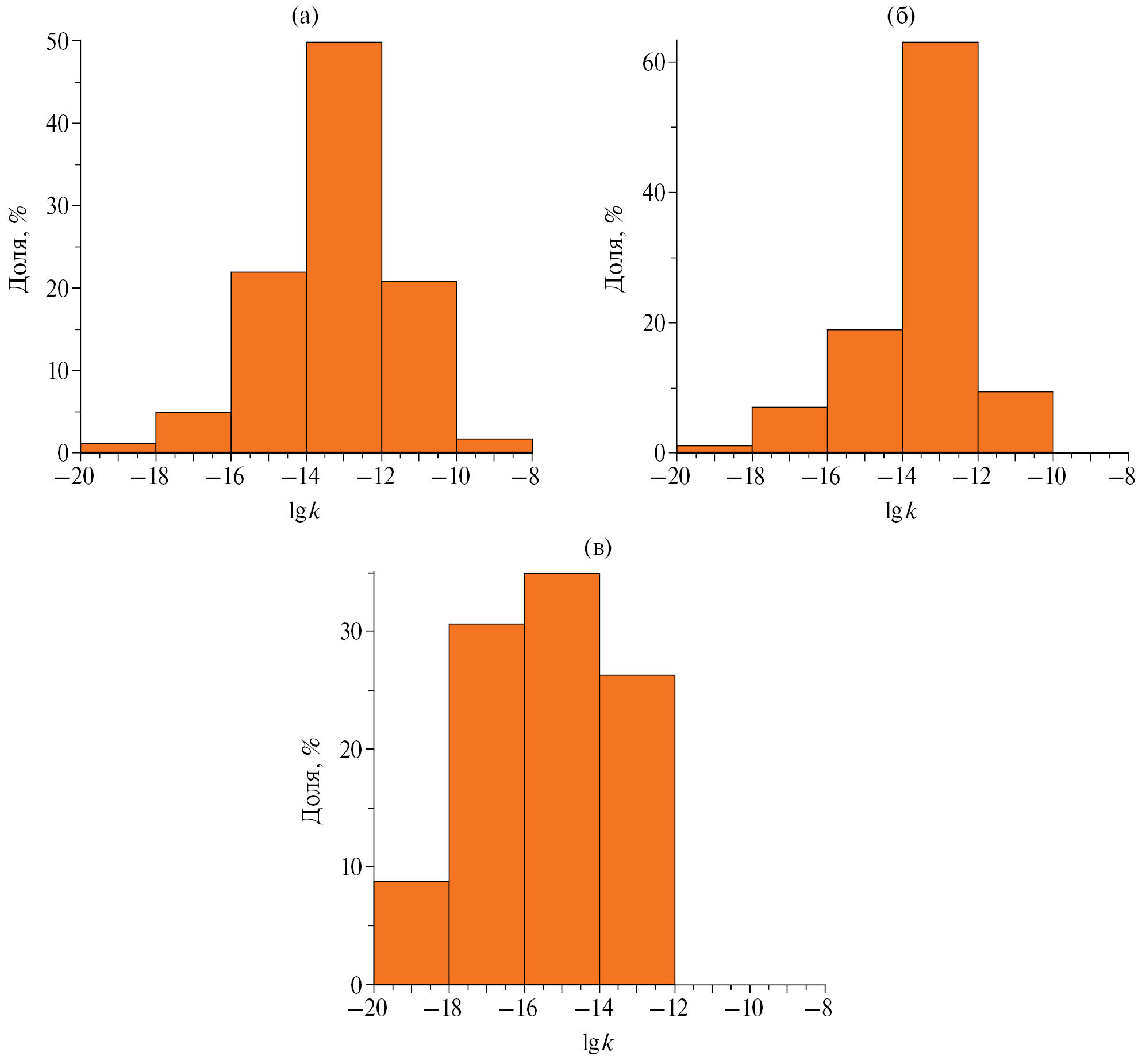 Рис. 5. Гистограммы распределения логарифма объемной проницаемости разломных зон для нескольких интервалов глубин: (а) – 0–1000 м (N = 183); (б) – 1000–2500 м (N = 84); (в) – 2500–9065 м (N = 23) (по данным работы [Scibek, 2020]).