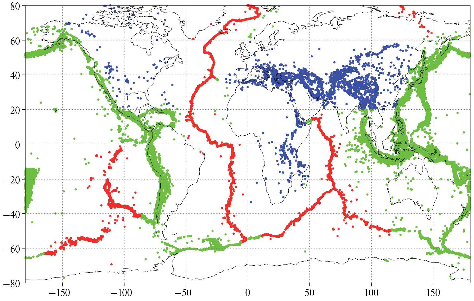 Рис. 1. Неглубокие и промежуточные землетрясения по каталогу GCMT, 1976–2022 гг.; синие точки – внутриконтинентальные события, зеленые – зоны субдукции, красные – зоны срединно-океанических хребтов.