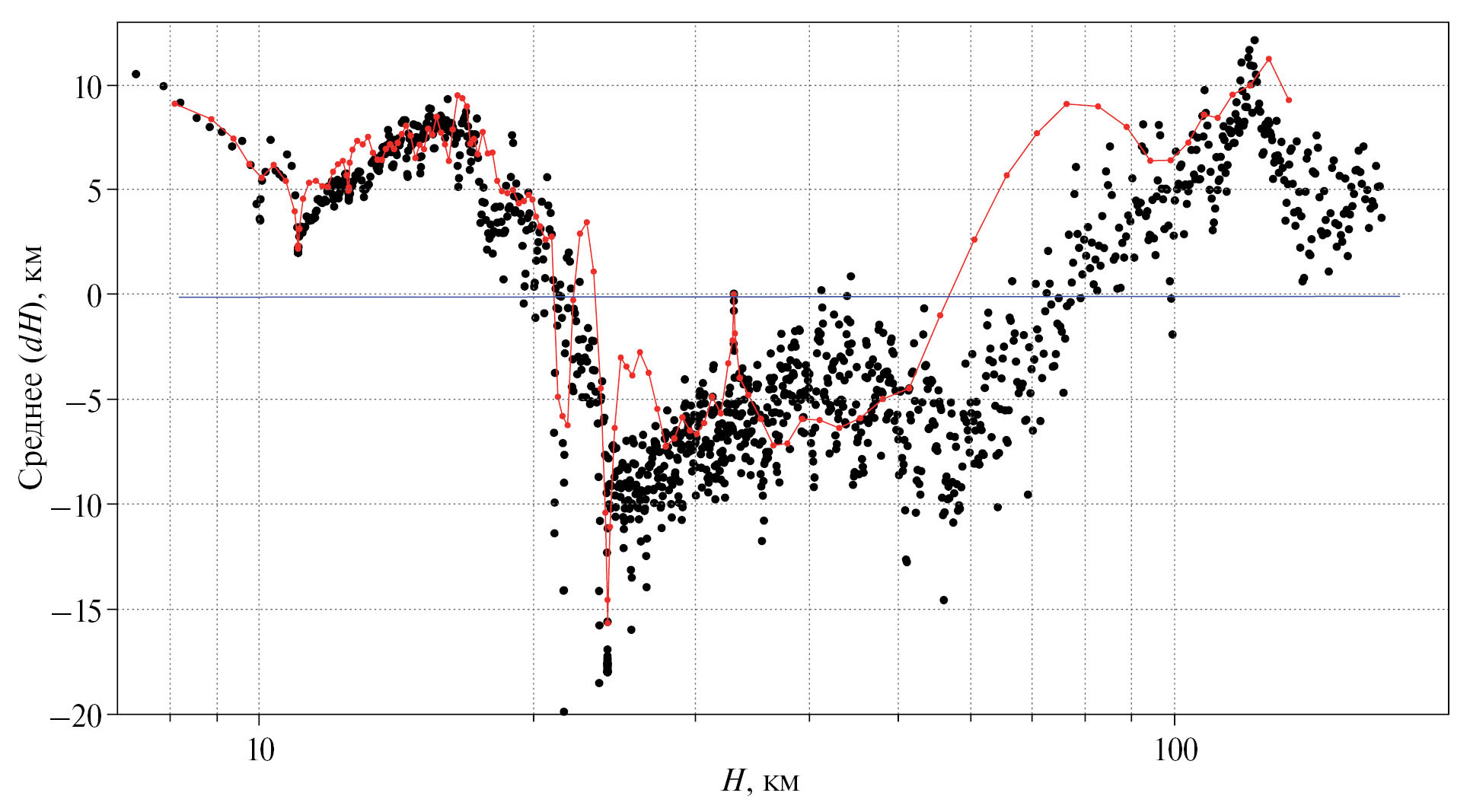 Рис. 2. Изменение средней разницы глубин землетрясений (dH) по решению сейсмического момента и гипоцентра; черные точки – области субдукции, красная кривая – внутриконтинентальные области.