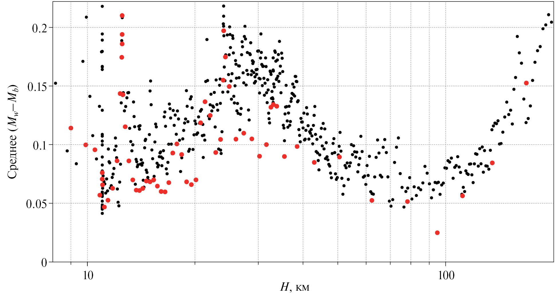 Рис. 3. Изменение средней разницы магнитуд (Mw–Mb); черные точки – зоны субдукции, красные – внутриконтинентальные области.