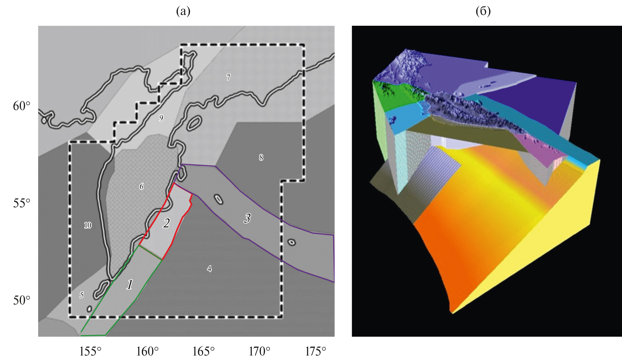 Рис. 1. Зоны сейсмичности Камчатского региона и его окрестностей: (a) [Левина и др., 2013] – поверхностное сечение (1 – сейсмофокальная зона Курил и Южной Камчатки; 2 – северная часть Камчатской сейсмофокальной зоны; 3 – Командорский сегмент Алеутской дуги). Пунктиром отмечена зона ответственности региональной сети; (б) – 3D.