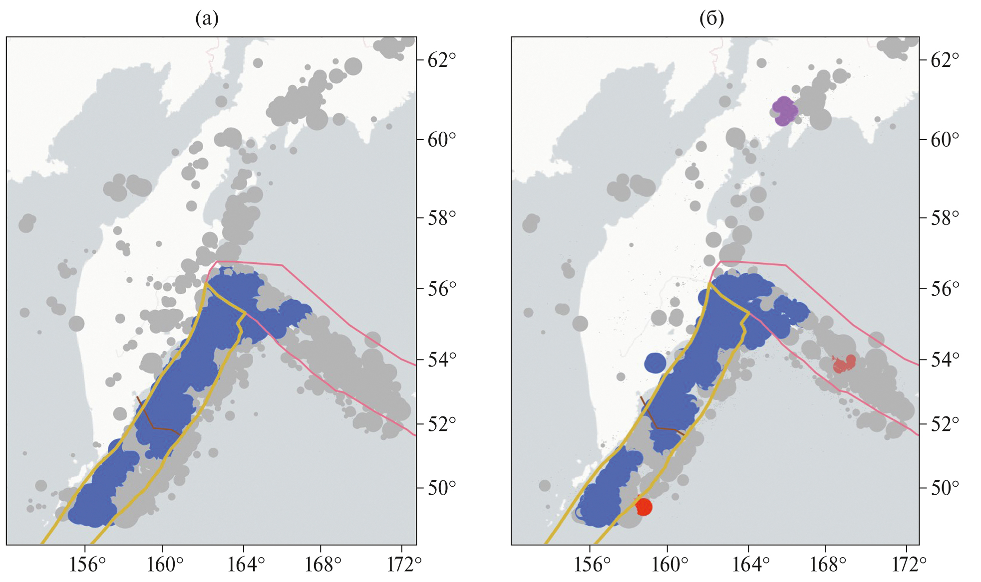 Радиус кластеризации Rq составляет 57.81 км для эпицентров землетрясений с магнитудой M ≥ 4.4 и 59.35 км для эпицентров с магнитудой M ≥ 3.5, соответственно. В один кластер (рис. 2а) вошло 79.0% (7884 событий) эпицентров землетрясений, зарегистрированных с 1963 по 2022 гг. Эпицентры событий с магнитудой M ≥ 3.5, вошедшие в четыре кластера (рис. 2б), составили 80.0% (22049 событий) от эпицентров землетрясений, зарегистрированных с 1996 по 2022 гг. Из них 21 207 эпицентров относятся к единому кластеру, занимающему территорию, совпадающую с территорией кластера на рис. 2а. В этот кластер вошли эпицентры двух из пяти неглубоких сильнейших землетрясений, произошедших за анализируемый период. А именно, землетрясение 05.12.1997 г., MW = 7.8 в северной части К–К сейсмофокальной зоны и землетрясение в Тихом океане 20.12.2018 г., MW = 7.3. С эпицентрами еще трех сильнейших событий связаны три небольших кластера на рис. 2б. Это Олюторское землетрясение, произошедшее в апреле 2006 г. в Корякском нагорье MW = 7.6, Ближне-Алеутское землетрясение 17.07.2017 г., MW = 7.7 и землетрясение, произошедшее в южной части К–К сейсмофокальной зоны 25.03.2020 г., MW = 7.5. Эпицентры самих указанных землетрясений не вошли в кластеры, выделенные алгоритмом DPS. Значения моментной магнитуды MW приведены по данным Геологической службы США (USGS).