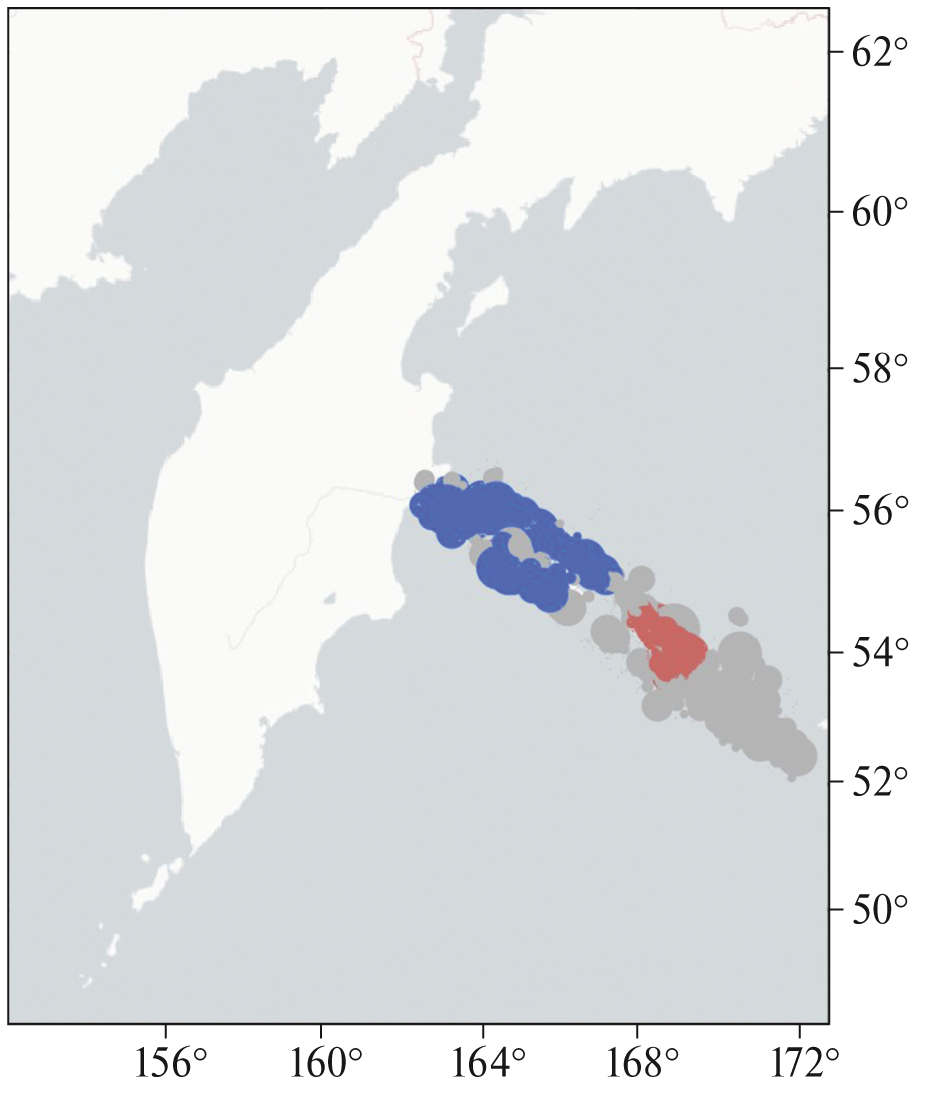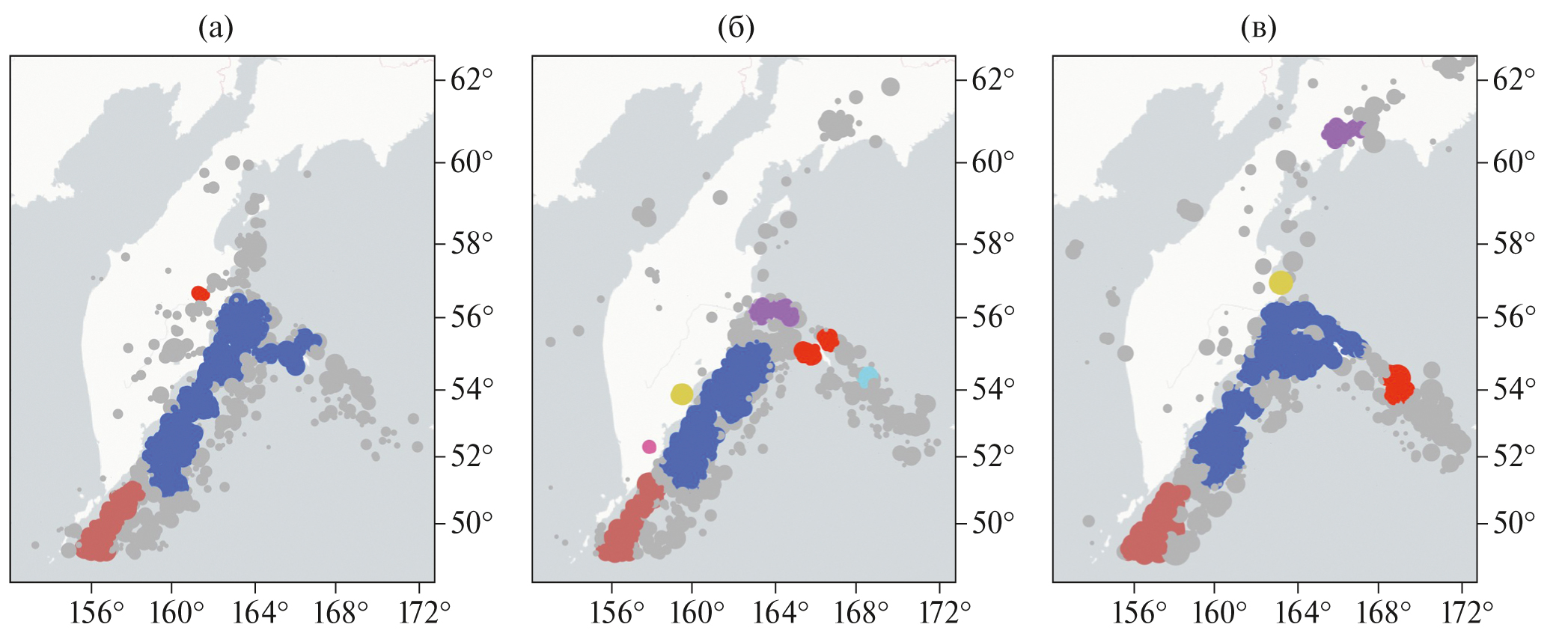 Разделение эпицентров на северный и южный участки прослеживается для всех трех подкаталогов, хотя граница, разделяющая кластеры, проходит южнее Авачинской бухты, по которой традиционно разделяют эти зоны. При анализе данных за полные временные интервалы с 1963 по 2022 гг. и с 1996 по 2022 гг., соответствующая граница наблюдается визуально (рис. 1). Однако алгоритм DPS объединяет события, произошедшие севернее и южнее этой границы, в один кластер.