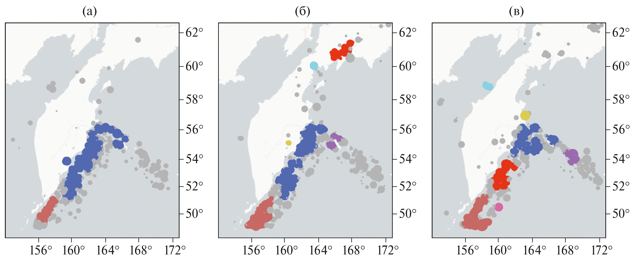 Рис. 3. Пространственное распределение эпицентров землетрясений с M ≥ 4.4 и h ≤ 70, объединенных в кластеры алгоритмом DPS (q = –2 и β = –0.5), зарегистрированных: (а) – с 1963 по 1982 гг.; (б) – с 1983 по 2000 гг.; (в) – с 2001 по 2022 гг.