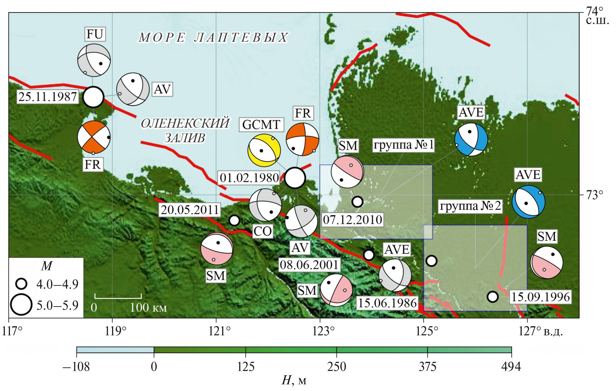 Рис. 5. Механизмы очагов землетрясений (в проекции нижней полусферы) Оленекского залива и прилегающих территорий, имеющиеся в составленной базе данных (M = 4.5–5.4, 1986–2011 гг.). Решения, полученные с помощью различных методов, обозначены цветом: серый – по знакам первых вступлений P-волн; оранжевый – по знакам первых вступлений P-волн и отношениям амплитуд P-, SV- и SH-волн; желтый – [Dziewonski et al., 1981]; розовый – по амплитудным спектрам поверхностных волн [Букчин, 1989]; синий – решения для групп слабых землетрясений, определенные методом [Мишарина и др., 1975]. Для литературных источников введены следующие обозначения: AVE – [Аветисов, 1991], AV – [Аветисов, 1993], CO – [Cook et al., 1986], FR – [Franke et al., 2000], FU – [Fujita et al., 1990], SM – [Seredkina, Melnikova, 2018]. Области, для которых получены групповые решения, обозначены серым цветом. Номера групп соответствуют табл. 2. Активные разломы показаны красными кривыми согласно работе [Zelenin et al., 2022].