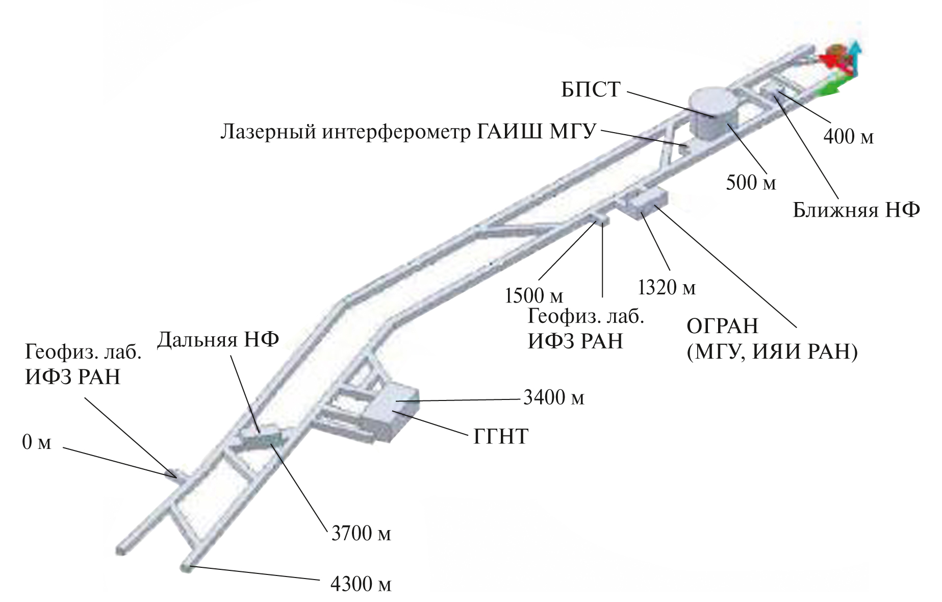 Рис. 6. Схема расположения подземных сооружений БНО ИЯИ РАН. Точке (1) соответствует указатель “Ближняя НФ”, точке (2) – “Лазерный интерферометр ГАИШ МГУ”, точке (3) – “ОГРАН”, точке (4) – “Дальняя НФ”.