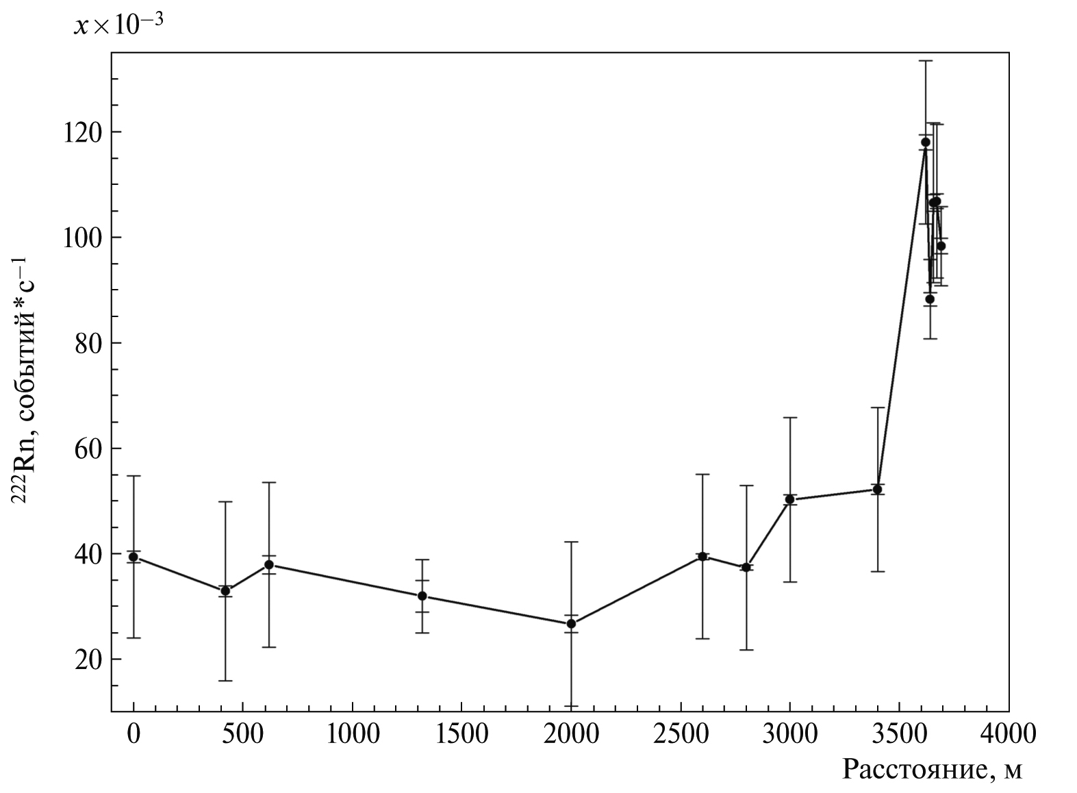 Статистическая ошибка средних значений не превышает 5–10%. Однако амплитуда вариаций значительно превосходит ее. Поэтому неопределенность, вносимая вариациями, может быть выражена в виде случайной ошибки. Заданные в такой форме средние значения в зависимости от расстояния между входом в штольню и точкой измерения представлены на рис. 8. Из данных видно, что содержание радона в потоке воздуха на протяжении 0–1420 м в пределах ошибок не меняется. А на отрезке 1420–3700 м содержание увеличивается примерно в 3 раза. Такое поведение можно объяснить, если предположить, что в штольне между отметками 1420 и 3700 м имеются точечные источники радона. Для проверки этого предположения на отметках 2000, 2600, 2800, 3000, 3400 м были взяты пробы воздуха непосредственно в объем ЦВИК, использованной в качестве переносного пробоотборника. Измерения проводились в оптимальных для работы аппаратуры условиях в точках (3) или (4). Поскольку измерения были единичными, в качестве систематической ошибки полученных данных использована ошибка значений в точке (1).
