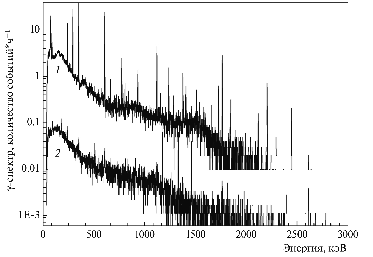 На рис. 9 для иллюстрации возможностей установки с ППД приведен спектр (1) излучения от воды пробы 1. Объем этой и других проб составляет 170 см3. Здесь же приведен спектр (2) фона.