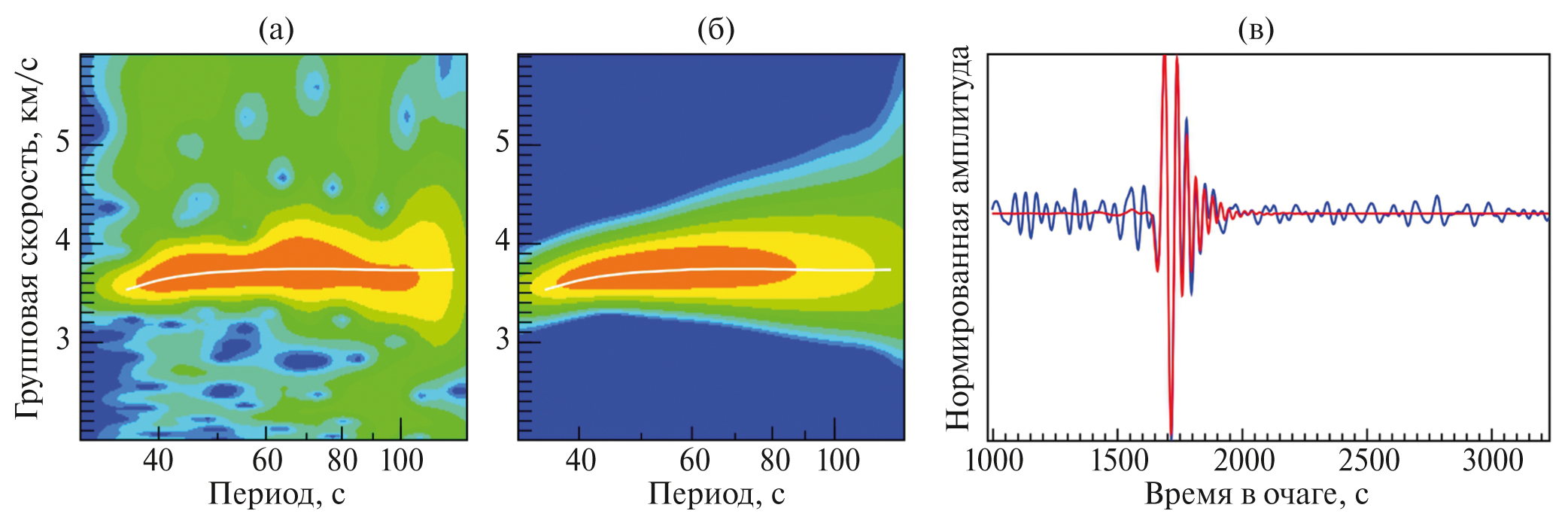 Рис. 2. Пример СВАН-обработки вертикальной компоненты станции CMB (azm = 66.09°, Δ = 6330 км): (а) и (б) – СВАН-диаграммы исходного и отфильтрованного сигнала соответственно (дисперсионная кривая групповой скорости показана белым цветом); (в) – исходная запись (синяя кривая) и результат ее фильтрации (красная кривая).