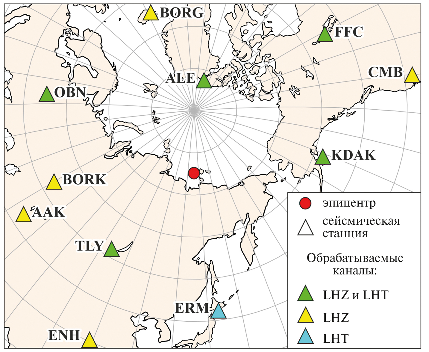 Рис. 3. Сейсмические станции, на которых получены спектры поверхностных волн. Коды станций соответствуют международному стандарту. LHZ – вертикальная компонента записи, LHT – трансверсальная компонента записи (результат вращения горизонтальных компонент, направленных на восток и север).