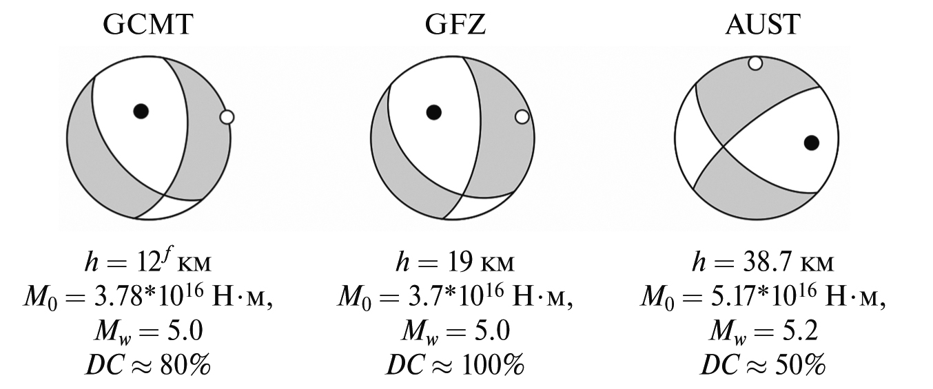 - Отличия полученных нами результатов от данных сейсмологических агентств GCMT и GFZ, скорее всего, обусловлены различиями в исходных данных, в т.ч. в их частотном составе. Решение, полученное AUST, вероятно, характеризуется большими ошибками вычислений. При этом наши оценки лучше согласуются с имеющейся геолого-геофизической информацией о тектонике исследуемого района.