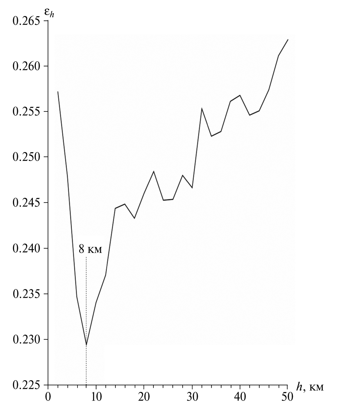 Рис. 6. Зависимость частной функции нормированной невязки ɛh от глубины очага (h, км) для диапазона периодов 50–120 с.