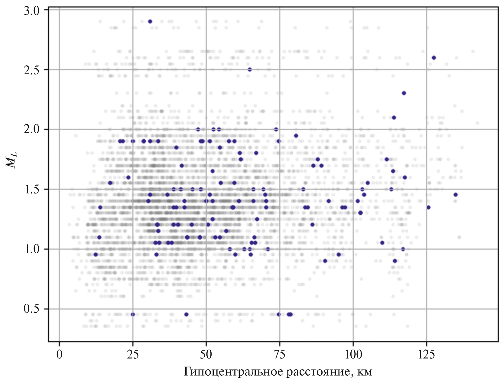Рис. 2. Распределение записей по локальной магнитуде ML и гипоцентральному расстоянию. Синим отмечены точки записей с оптимальным отношением сигнал–шум и использующиеся в настоящем исследовании.