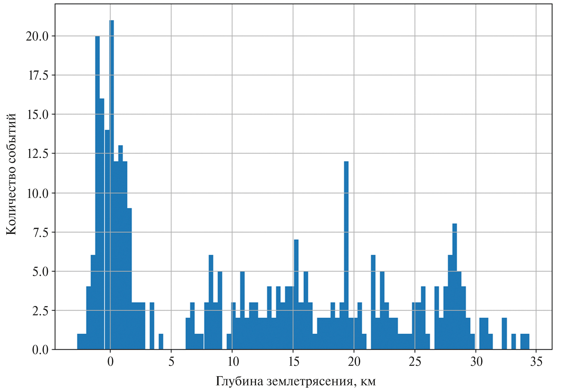 Рис. 3. Гистограмма распределения глубин землетрясений под Ключевской группой вулканов.