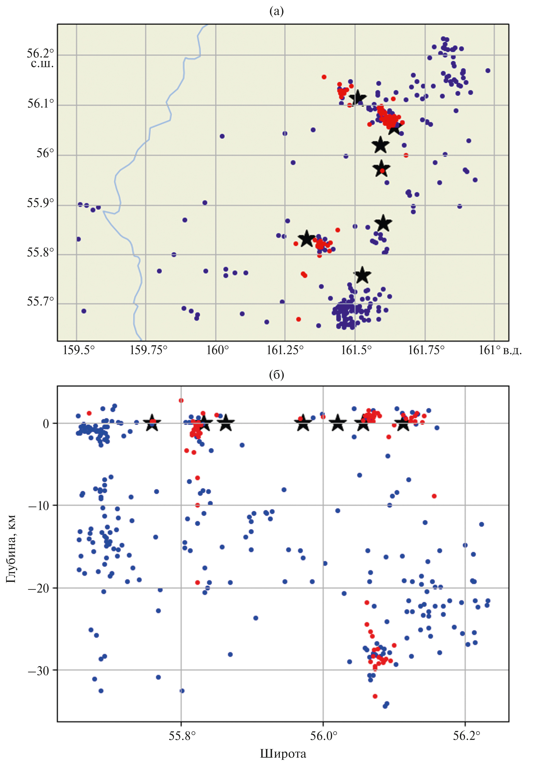 Рис. 4. Карта (а) и разрез (б) с землетрясениями под КГВ, записанными в рамках эксперимента KISS. Синие круги – ВЧ землетрясения; красные круги – ДП землетрясения; черные звезды – вершины вулканов.