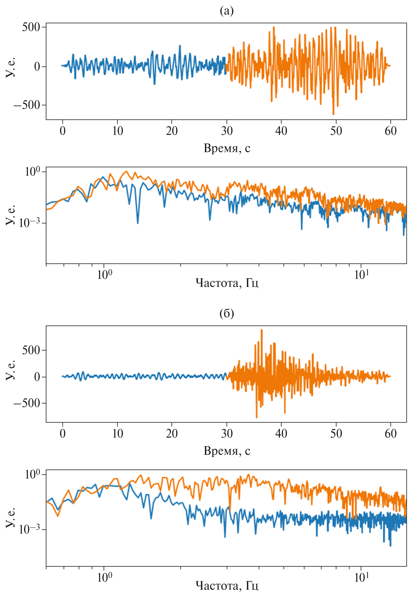 Рис. 5. Записи событий (сверху) и соответствующие им спектры Фурье сигнала и шума (снизу), нормированные на максимальную амплитуду из спектра сигнал/шум. Синий – запись шума; оранжевый – запись события. Для левой записи ВЧ землетрясения: SNR = 2.7, SNR* = 0.6; для правой записи ВЧ землетрясения: SNR = 3.6, SNR* = 3.0.