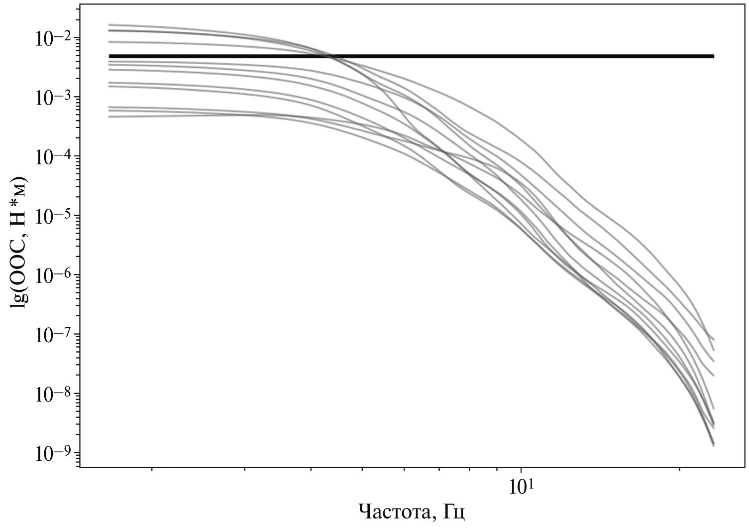 Рис. 8. Индивидуальные станционные спектры смещений (по оси ординат – ОСС или очаговый спектр смещений) для землетрясения 2015.11.28 (Mw = 2.1). Прямая линия – уровень площадки межстанционной медианы спектра на низких частотах, по которому определяется сейсмический момент.
