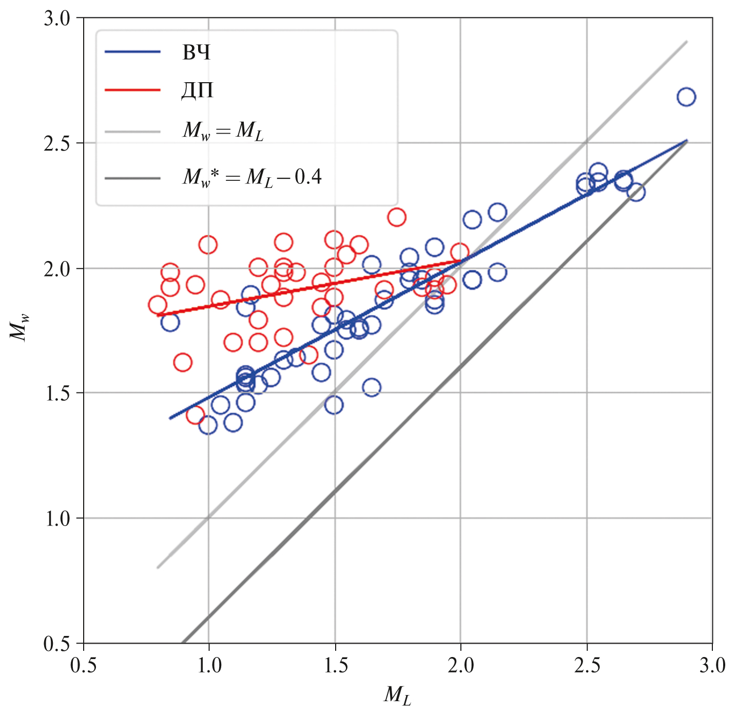 Рис. 9. Зависимость полученных моментных магнитуд Mw от локальной магнитуды ML для высокочастотных (синие) и длиннопериодных (красные) землетрясений.