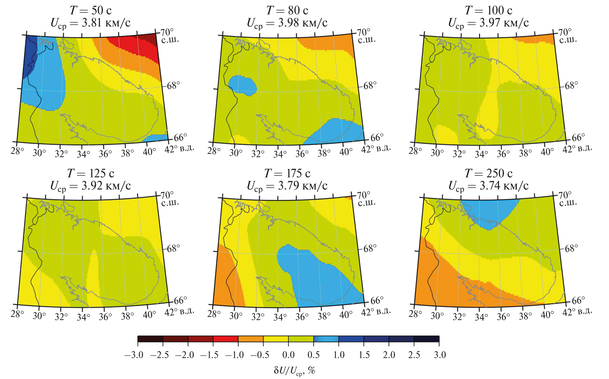 В качестве исходного материала для построения трехмерной модели распределения скоростей S-волн в коре и мантии Кольского региона использовались карты распределений групповых скоростей волн Рэлея в диапазоне периодов 10–250 с [Филиппова, Соловей, 2022], построенные с помощью метода поверхностно-волновой томографии для случая сферической поверхности [Yanovskaya, Kozhevnikov, 2003; Яновская, 2015]. Карты основаны на данных о дисперсии групповых скоростей фундаментальной моды волн Рэлея для 2751 трассы эпицентр–станция, часть из которых (1194 трасс) была получена непосредственно для рассматриваемого региона в работе [Филиппова, Соловей, 2022], а другая часть (1557 трасс) представляет собой выборку дисперсионных кривых для всей Арктики [Середкина, 2019]. Примеры используемых карт на отдельных периодах приведены на рис. 2.