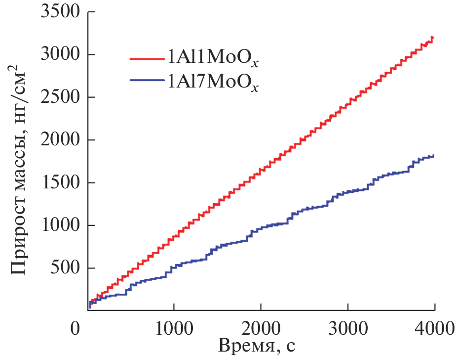 В работе продемонстрировано атомно-слоевое осаждение (АСО) алюминий-молибденовых оксидных пленок (AlxMoyOz) с использованием триметилалюминия (ТМА, Al(CH3)3), оксотетрахлорида молибдена (MoOCl4) и воды. Исследование процесса роста пленок осуществляли in situ с использованием кварцевых пьезоэлектрических микровесов и ex situ рентгеновскими методами анализа тонких пленок. АСО AlxMoyOz проводили с использованием суперциклов, состоящих из субциклов ТМА/H2O и MoOCl4/H2O. В работе получены два типа пленок, где соотношение субциклов составляло 1 : 1 (1Al1MoO) и 1 : 7 (1Al7MoO). При 150°C показана линейность роста пленок с постоянной роста 3.0 и 5.7 Å/суперцикл для 1Al1MoO и 1Al7MoO соответственно. Плотность полученных пленок составила 3.6 и 3.9 г/см3 для 1Al1MoO и 1Al7MoO соответственно, а шероховатость была в пределах 20 Å. Степень окисления молибдена в полученных пленках составляла 6+, 5+ и 4+. Рентгендифракционный анализ показал, что полученные пленки имели аморфную структуру.