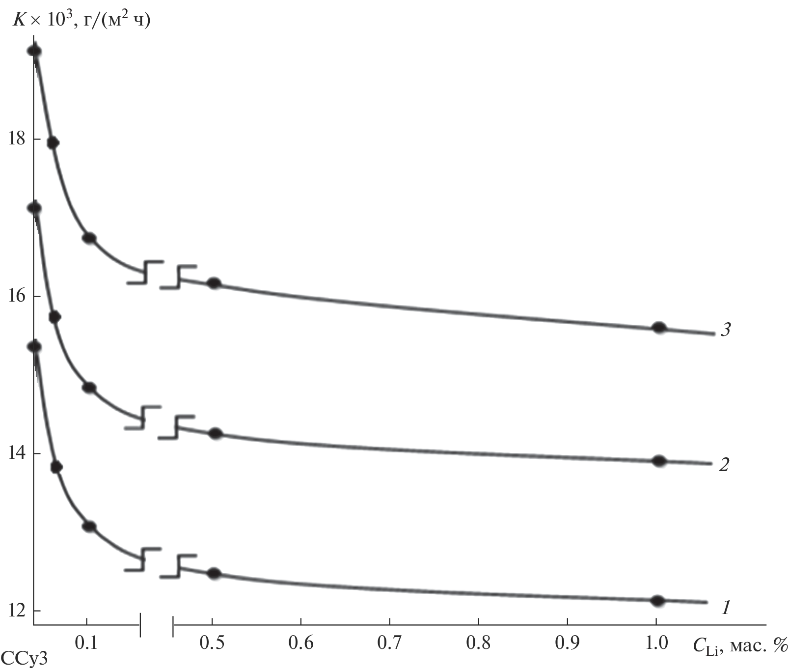 This paper presents corrosion and electrochemical characterization data illustrating the effect of 0.05–1.0 wt % lithium as a structure modifier on the anodic behavior of lead–antimony alloy SSu3 (Pb + 3 wt % Sb) in NaCl electrolyte. The alloy was studied potentiostatically in potentiodynamic mode at a potential sweep rate of 2 mV/s. The results demonstrate that increasing the concentration of the aqueous NaCl solution shifts the corrosion, pitting, and repassivation potentials of the alloys to negative values. The free corrosion potential of the alloys shifts over time to positive values. The same occurs with increasing lithium concentration in SSu3. Moreover, increasing the NaCl concentration in the electrolyte increases the corrosion rate of the alloys, independent of their composition. Lithium additions to SSu3 improve its corrosion resistance. The alloys have been shown to corrode by the pitting mechanism. Acting as a structure modifier, lithium increases their pitting and repassivation potentials, improving the pitting corrosion resistance of the alloys and helping to eliminate emerging pitting corrosion spots.