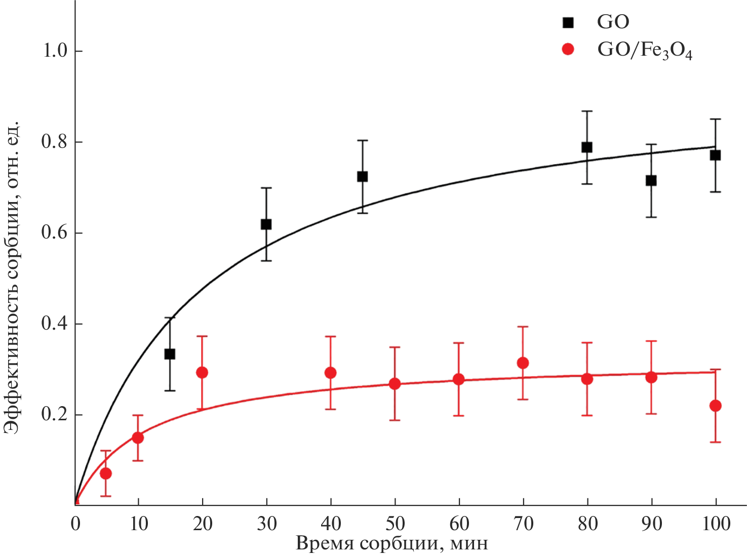 This paper reports novel techniques for the preparation of aerogels based on graphite oxide (GO) and nanocomposites of GO and superparamagnetic iron oxide nanoparticles (GO/Fe3O4) and discusses specific features of the synthesized materials as sorbents of doxorubicin from aqueous solutions. Sorption efficiency of the aerogel based on GO and superparamagnetic iron oxide nanoparticles (GO/Fe3O4) and the GO aerogel has been determined to be about 50 and 85%, respectively. At the same time, one advantage of the magnetic aerogel is that the sorbent can be removed from solution by an external magnetic field. In the case of the formal description of the sorption process by the pseudo-first-order rate equation (@) where W is sorption efficiency, the rate constant is k = 0.042 ± 0.004 min–1 for graphite oxide and 0.0832 ± 0.018 min–1 for the GO/Fe3O4 nanocomposite. The GO/Fe3O4 composite saturates about a factor of 2 more rapidly than pure GO. Sorption by the magnetic aerogel is an exothermic process. The highest efficiency of sorption from a solution with a concentration of 40 mg/L was 95% at 25°C and 60% at 40°C. The present results demonstrate that magnetic graphite aerogels are potentially attractive for use as sorbents and matrices for prolonged-release antitumor drugs.