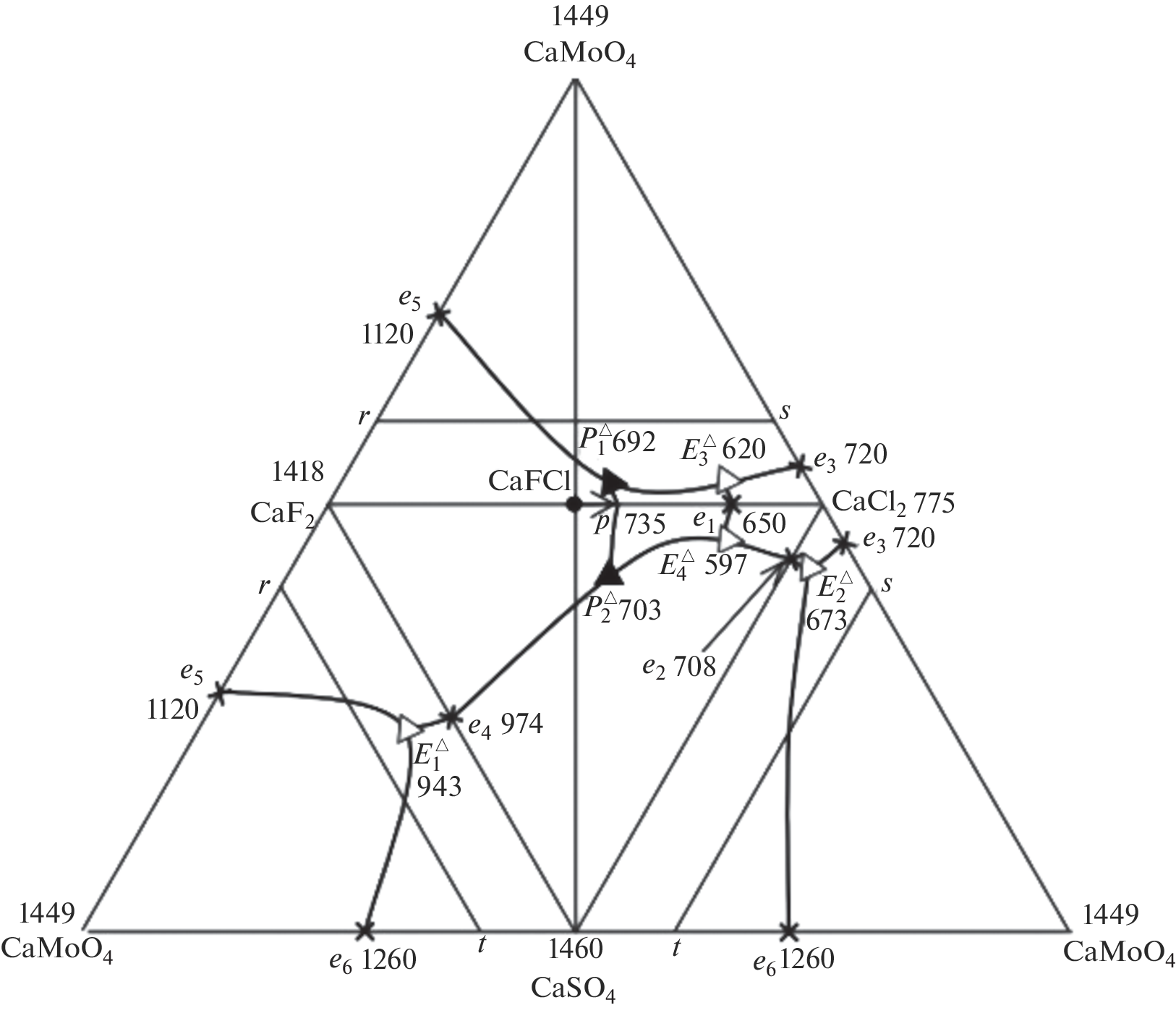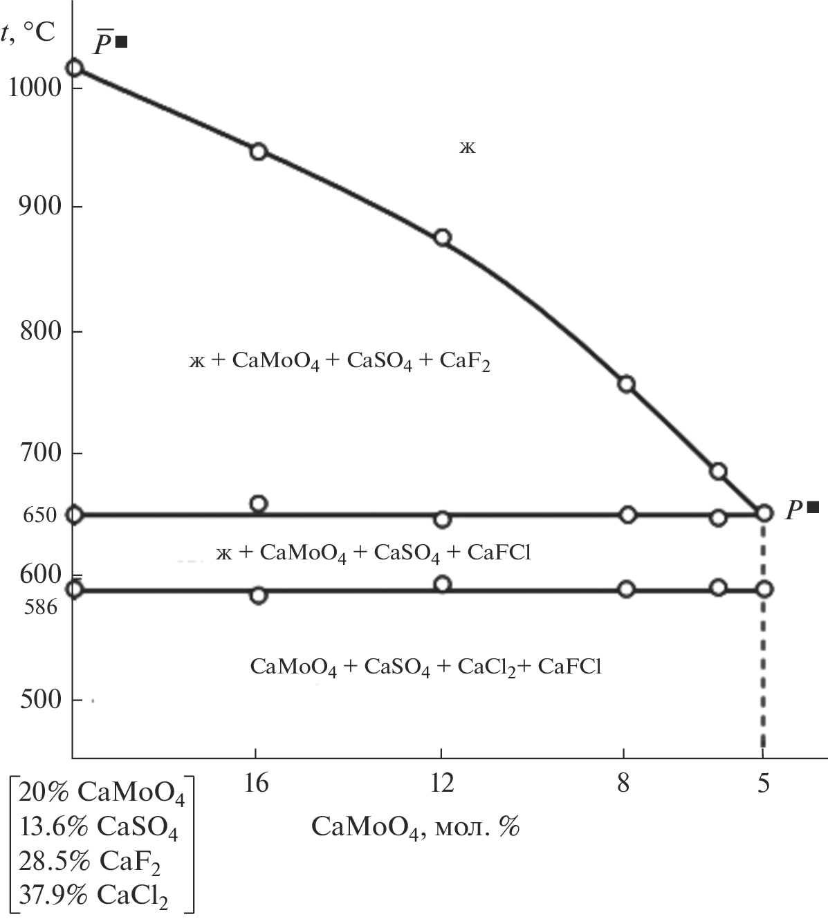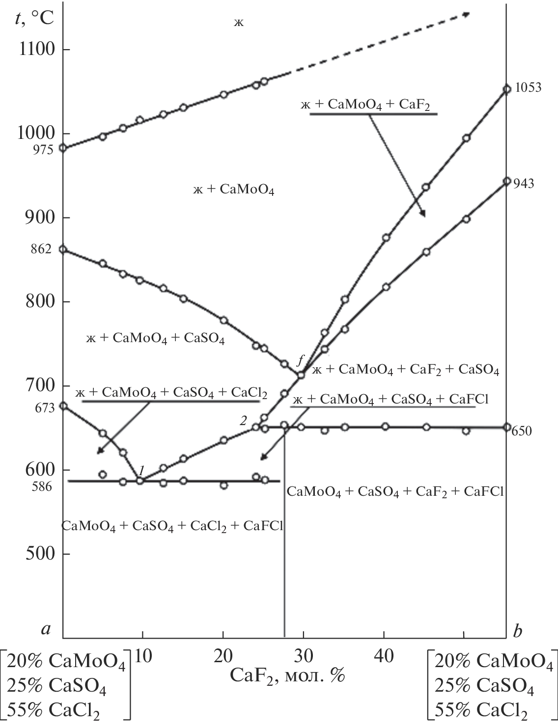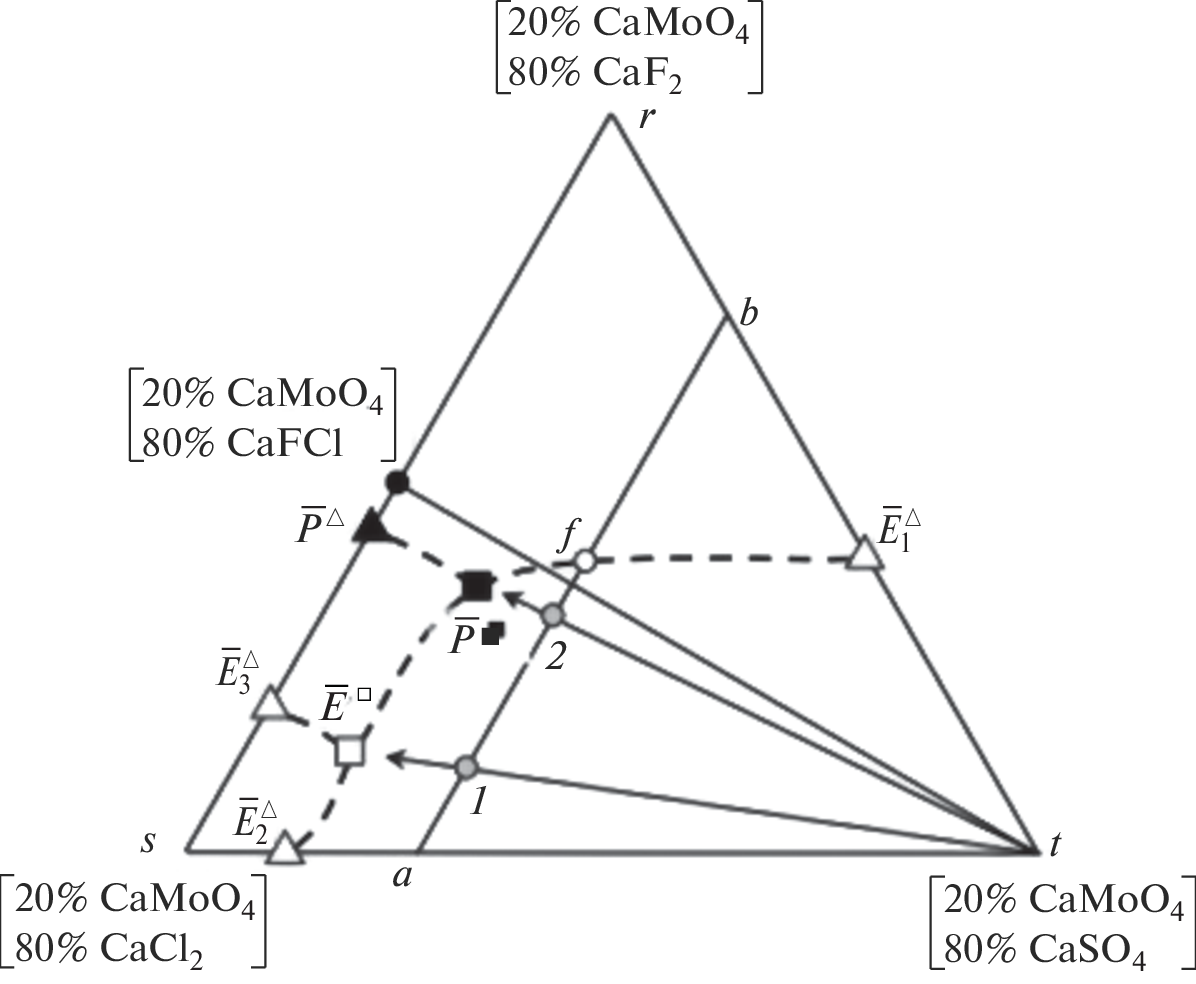 Phase equilibria in the quaternary system СaMoO4–СaSO4–СaF2–СaCl2 have been studied using physicochemical analysis (differential thermal analysis). We have determined the composition, melting point, and enthalpy of fusion of the quaternary peritectic point (melting point, 650°C; composition: 33.8% CaF2, 45% CaCl2, 16.2% CaSO4, and 5% CaMoO4; enthalpy of fusion, 256 ± 5.1 kJ/kg) and quaternary eutectic point (melting point, 586°C; composition: 15.8% CaF2, 73.3% CaCl2, 9.9% CaSO4, and 1% CaMoO4; enthalpy of fusion, 485 ± 9.7 kJ/kg) in the system studied.