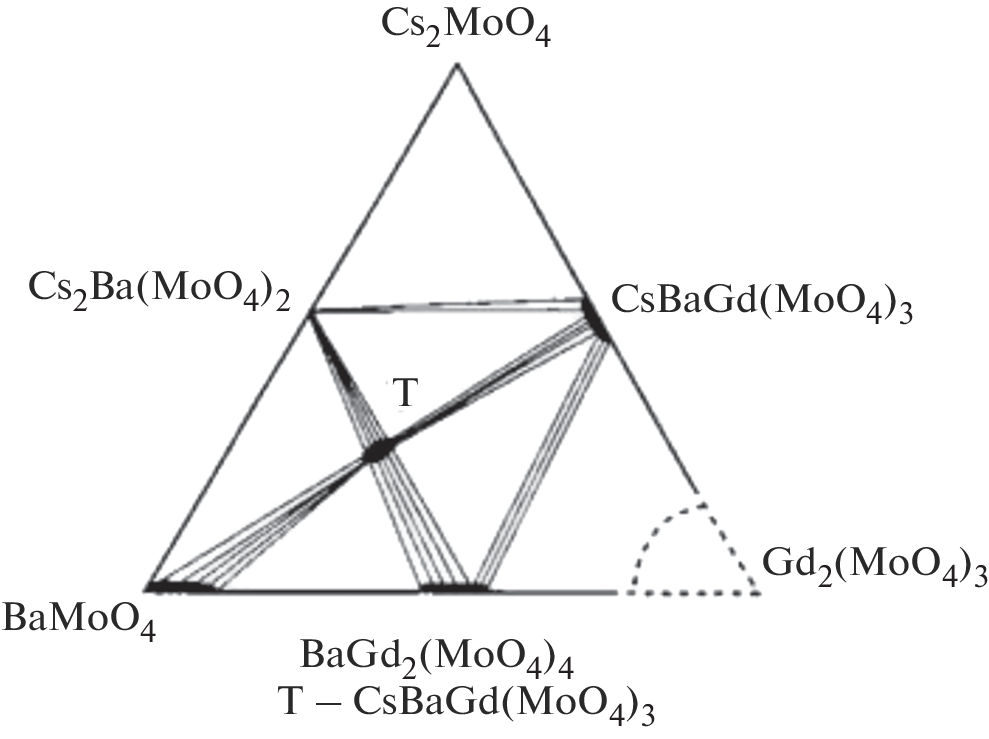 We have investigated phase relations along a number of joins in the subsolidus region of the Cs2MoO4–BaMoO4–Gd2(MoO4)3 system using X-ray diffraction and differential thermal analysis and constructed its phase compatibility diagram. A ternary molybdate with the composition CsBaGd(MoO4)3 and a monoclinic scheelite-like structure (sp. gr. P21/n) has been synthesized. Codoping CsBaGd(MoO4)3 with Er3+/Yb3+ ions, we have obtained an upconversion phosphor exhibiting anti-Stokes luminescence in the range 400–700 nm under IR excitation (λex = 977 nm). The synthesized phosphor has been characterized by X-ray diffraction, differential thermal analysis, and vibrational spectroscopy, and its luminescence spectrum has been measured.