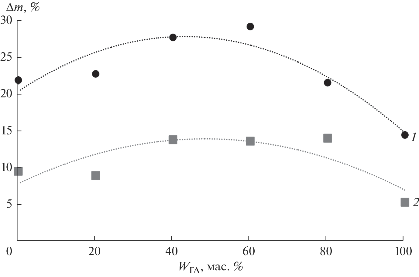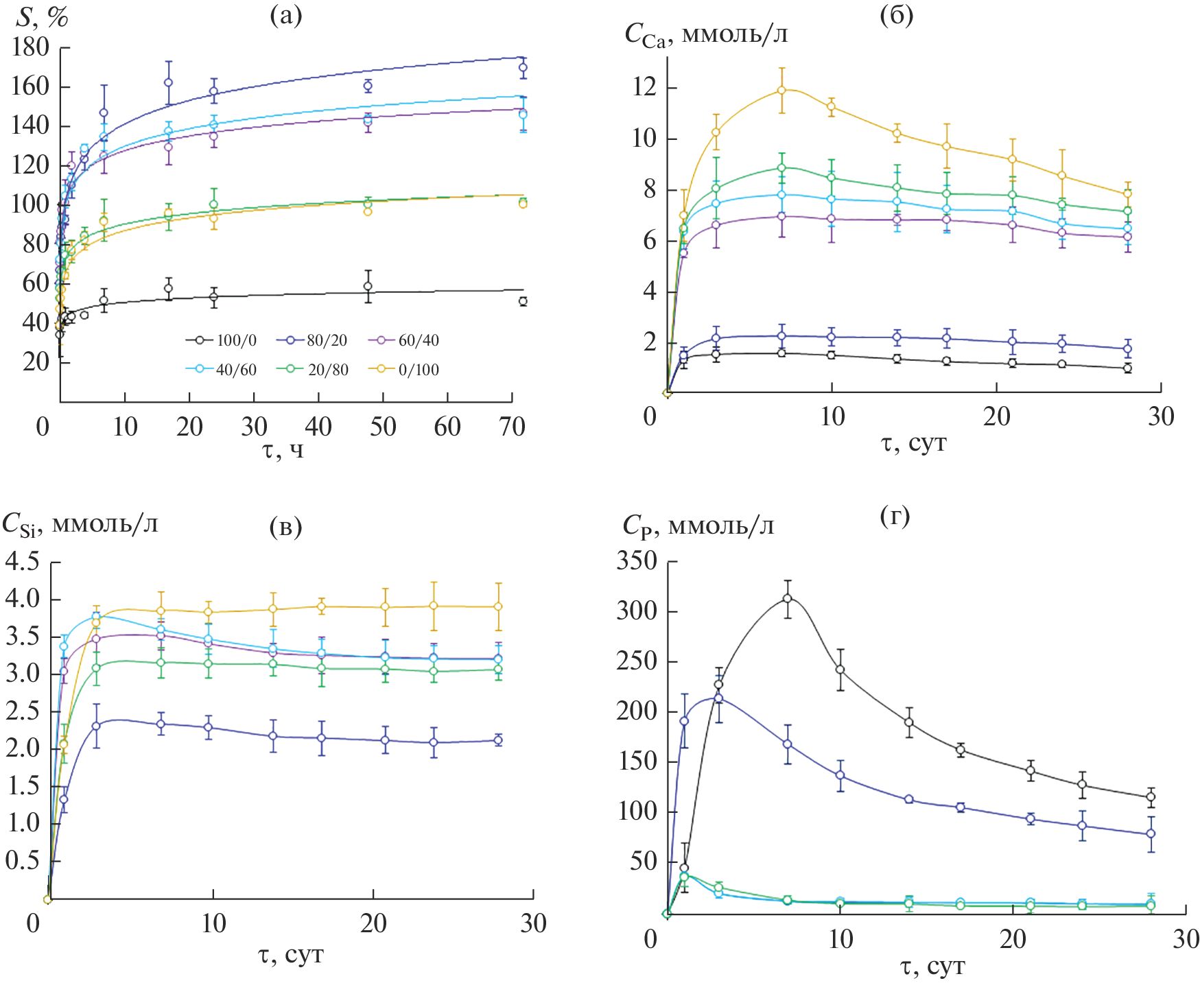 В ходе исследования in vitro установлено, что гранулы на основе желатина и синтетических керамических порошков с варьируемой пропорцией Са10(РО4)6(ОН)2 и β-СаSiO3 при контакте с трис-буфером быстро гидратируются и набухают, увеличиваясь в размерах до 1.2 раз. Далее они постепенно деградируют, выделяя в раствор ионы кальция, фосфатные и силикатные анионы. Близкие концентрации данных ионов обнаружены в системах с материалами, содержащими от 20 до 60 мас. % силиката кальция. Показано, что убыль массы композитов за счет растворения минеральных компонентов и желатина выше, чем у гранул только из апатита или волластонита.