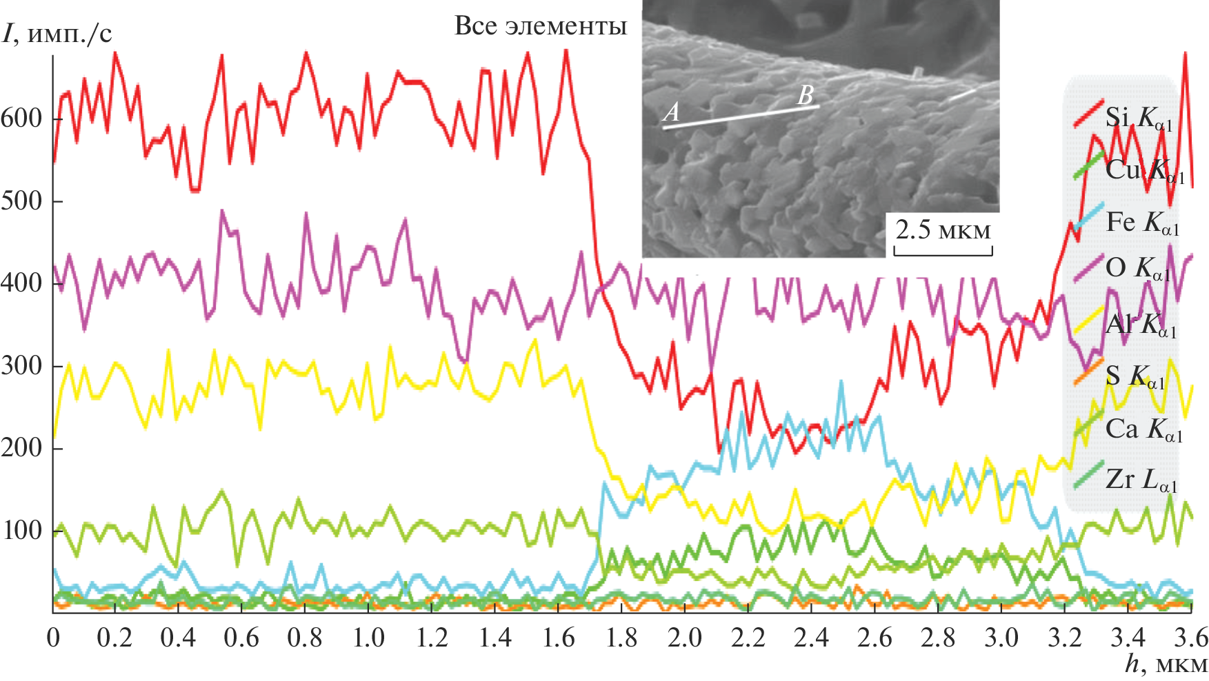 Porous ceramic materials have been prepared from BS16-6-76 chopped basalt fiber with CuS and ZrO2 additions by granulation, pressing, and subsequent sintering in air. Computer-controlled X-ray diffraction measurements have been used to carry out profile analysis and assess the qualitative and relative quantitative phase compositions of the materials. We have identified the sequence of phase transformations in the basalt fiber and confirmed that fiber crystallization during cooling after sintering begins with the formation of aluminosilicate spinel nuclei, which act as crystallization centers and become incorporated into the structure of orthoclase. The last to form in the phase hierarchy is a low-molecular-weight Fe-containing phase, namely, hematite (α-Fe2O3), built in a framework silicate of isomorphous series. The surface of the basalt fiber in the sintered material modified with copper sulfide and zirconium oxide additions has been shown to be covered with ~500-nm inclusions of a crystalline phase.