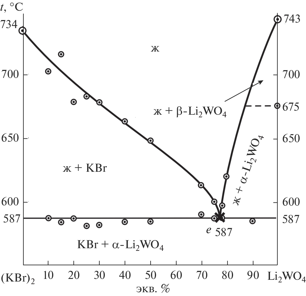 We have studied the ternary reciprocal system Li+, K+ || Br–, ". A likely phase compatibility diagram of the system has been chosen using thermodynamic calculations of the enthalpy and Gibbs energy of exchange reactions and confirmed by differential thermal analysis data for the stable joins KBr–Li2WO4 and KBr–Li2WO4∙K2WO4. The stable joins have been shown to be pseudobinary systems, and their T–x phase diagrams have been mapped out. We have constructed a phase tree of the system, which has a linear structure and includes three stable triangles (LiBr–KBr–Li2WO4, KBr–Li2WO4–Li2WO4∙K2WO4, and KBr–Li2WO4∙K2WO4–K2WO4) connected to each other by two stable joins. To find ternary eutectic mixtures in the stable triangles, T–x phase diagrams for a number of sections have been constructed. We have measured the specific enthalpy of fusion of the pseudobinary and ternary eutectics. The ternary mixture with the lowest melting point in the Li+, K+ || Br–, @ system, 328°C, has the highest specific enthalpy of fusion: 200 kJ/kg.
