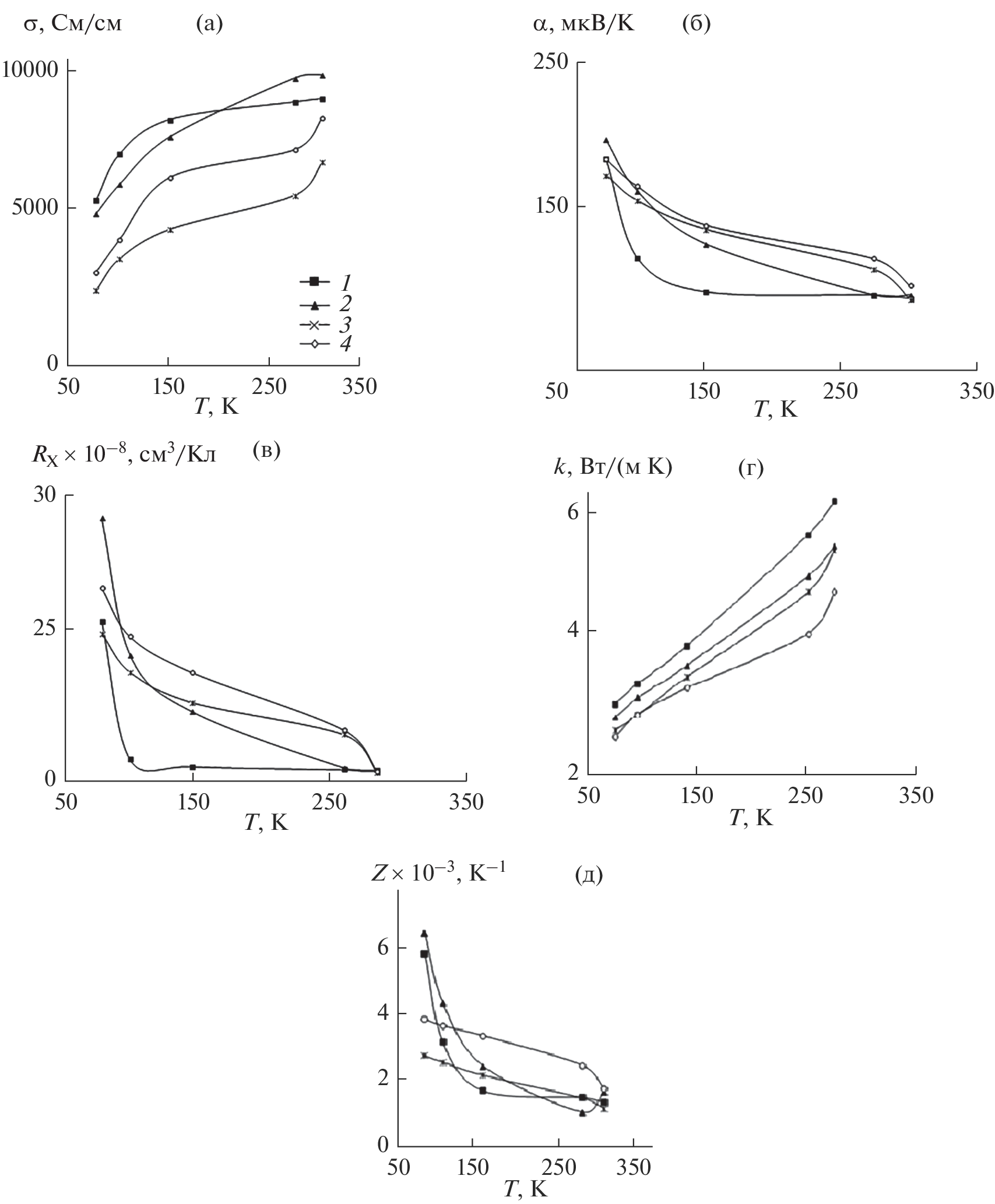 The electrical conductivity (σ), thermoelectric power (α), Hall coefficient (RH), and thermal conductivity (κ) of unmodified and 0.5 wt % ZrO2-modified extruded samples of the Bi0.85Sb0.15 solid solution have been measured in the range ~77–300 K at a magnetic field strength of up to ~74 × 104 A/m. The results demonstrate that the addition of 0.5 wt % ZrO2 to Bi0.85Sb0.15 reduces the phonon component of its thermal conductivity, leading to an increase in its thermoelectric figure of merit (Z) to ~6.4 × 10–3 K–1. The use of the modified material is expected to considerably improve parameters of related low-temperature thermoelectric converters. At ~77 K, in both the unmodified and ZrO2-modified Bi0.85Sb0.15 solid solutions heat is transported largely by lattice vibrations.