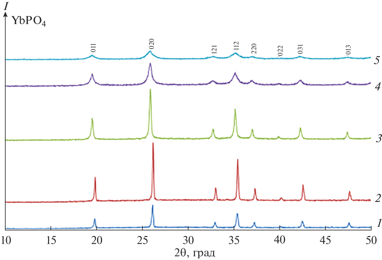 Phosphates isostructural with the mineral monazite—NdPO4, GdPO4, and a La0.3Nd0.5Sm0.1Eu0.1PO4 solid solution modeling the composition of the lanthanide components of radioactive waste—and YbPO4, crystallizing in the xenotime structure, have been prepared via direct precipitation from acid solutions. Under hydrothermal conditions, we have prepared the crystalline hydrate NdPO4·0.67Н2О isostructural with the mineral rhabdophane and the YbPO4 phosphate with the xenotime structure. The powders range in crystallite size from 13 to 65 nm. The particle morphology and size have been shown to depend on the synthesis process. During heating to 1170 K, the phase composition of the powders remained unchanged. Their average 900-K thermal expansion coefficients lie in the range (5.6–9.6) × 10–6 K–1, so these phosphates can be regarded as having medium thermal expansion.