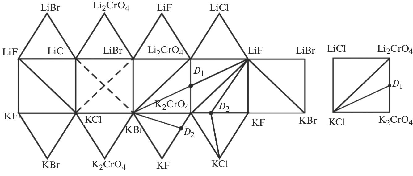 has been divided into simplexes using graph theory: by making up an adjacency matrix and solving a logical expression. The results have been used to construct the phase tree of the system, which has a linear structure and consists of four stable secant tetrahedra, four stable pentatopes, and one stable hexatope. The number and composition of phases crystallizing in the system have been predicted. The LiF–KCl–KBr–Li2CrO4 stable tetrahedron has been studied using differential thermal analysis and X-ray diffraction. The tetrahedron has no invariant equilibrium points. The continuous series of solid solutions between potassium chloride and potassium bromide has been shown to be stable, without decomposition. Three solid phases have been shown to crystallize in the tetrahedron: LiF, Li2CrO4, and KClxBr1–x.