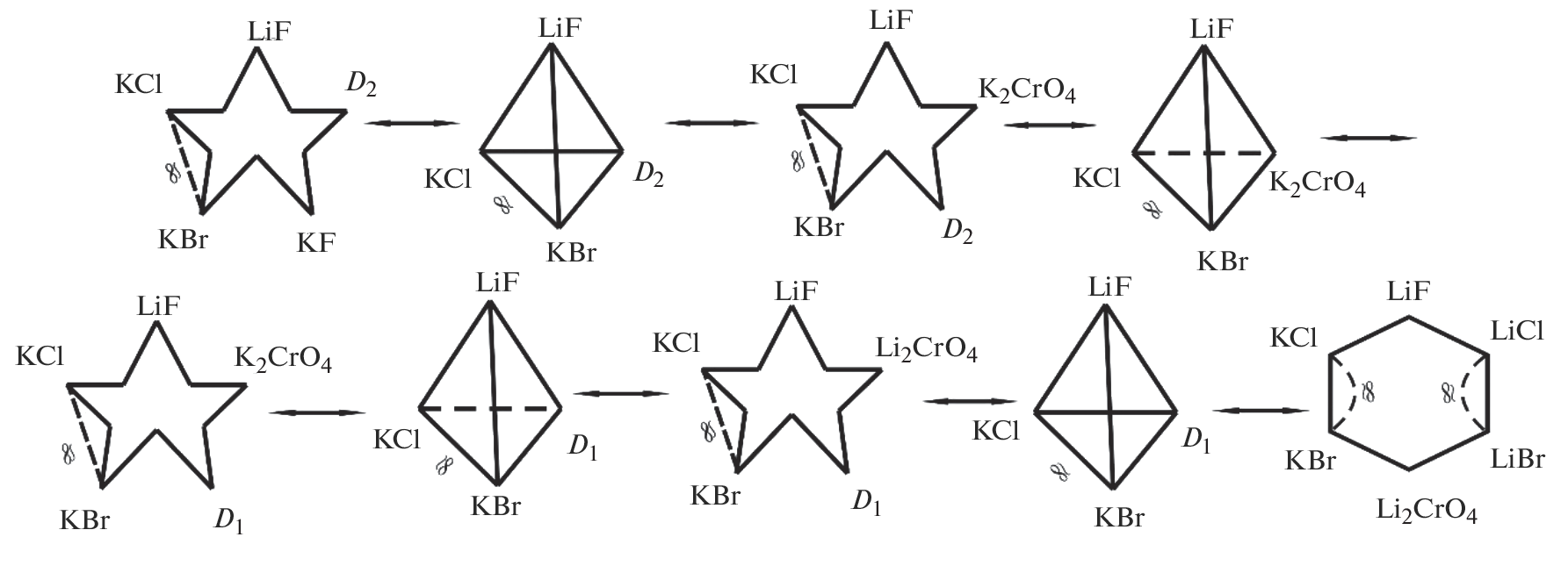 - Демина М.А., Ненашева А.В., Чудова А.А. и др. Фазовые равновесия в стабильном тетраэдре LiF–KF–KBr–K2CrO4 четырехкомпонентной взаимной системы Li,K||F,Br,CrO4 // Журн. неорган. химии. 2016. Т. 61. № 7. С. 927–930. https://doi.org/10.7868/S0044457X16070035