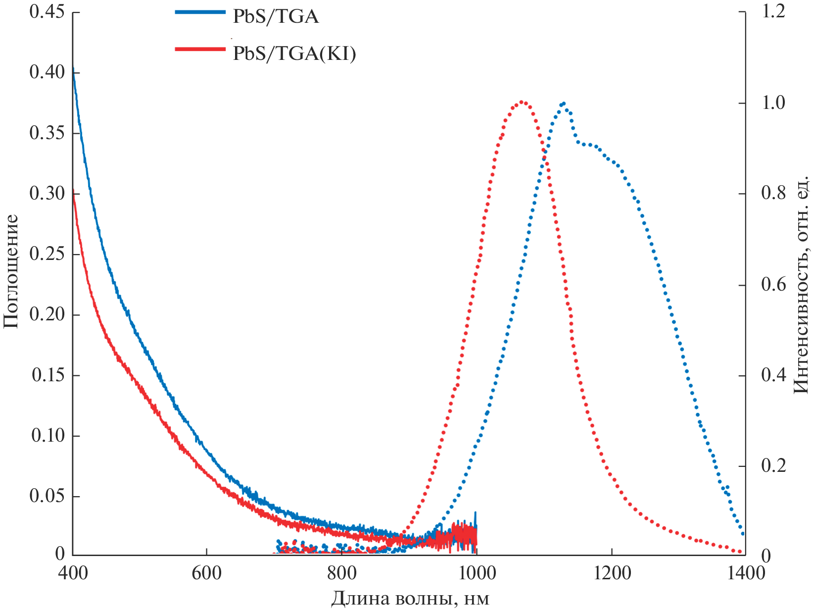 In this paper, we discuss general trends in the IR luminescence of colloidal PbS quantum dots 3 nm in average size, capped with thioglycolic acid molecules (PbS/TGA QDs). Treatment of the PbS/TGA QDs with a KI solution has been shown to cause a shift of a composite luminescence band peaking at 1120 nm to shorter wavelengths, to 1060 nm; an increase in the quantum yield of its shorter wavelength component, related to excitonic emission, from 1 to 10%; and quenching of its longer wavelength component, due to radiative recombination at defect levels. In this process, the cubic structure of PbS undergoes no changes. The average size of the PbS/TGA QDs has been shown to decrease slightly, by 0.2–0.3 nm. The conclusion has been drawn that the increase in the quantum yield of excitonic emission from the PbS/TGA QDs as a result of KI treatment is due to the more efficient passivation of interfacial defects, which act as both recombination luminescence and nonradiative carrier recombination channels. Using thermoluminescence in the temperature range from 80 to 350 K, we have demonstrated the presence of two types of shallow localized states, at 0.17- and 0.25-eV depths, whose density is only slightly sensitive to treatment of the PbS/TGA QDs with a KI solution. We assume that some of the traps identified are due to native defects in the nanocrystals—interstitial lead and sulfur ions—rather than to dangling bonds of surface lead and sulfur atoms.