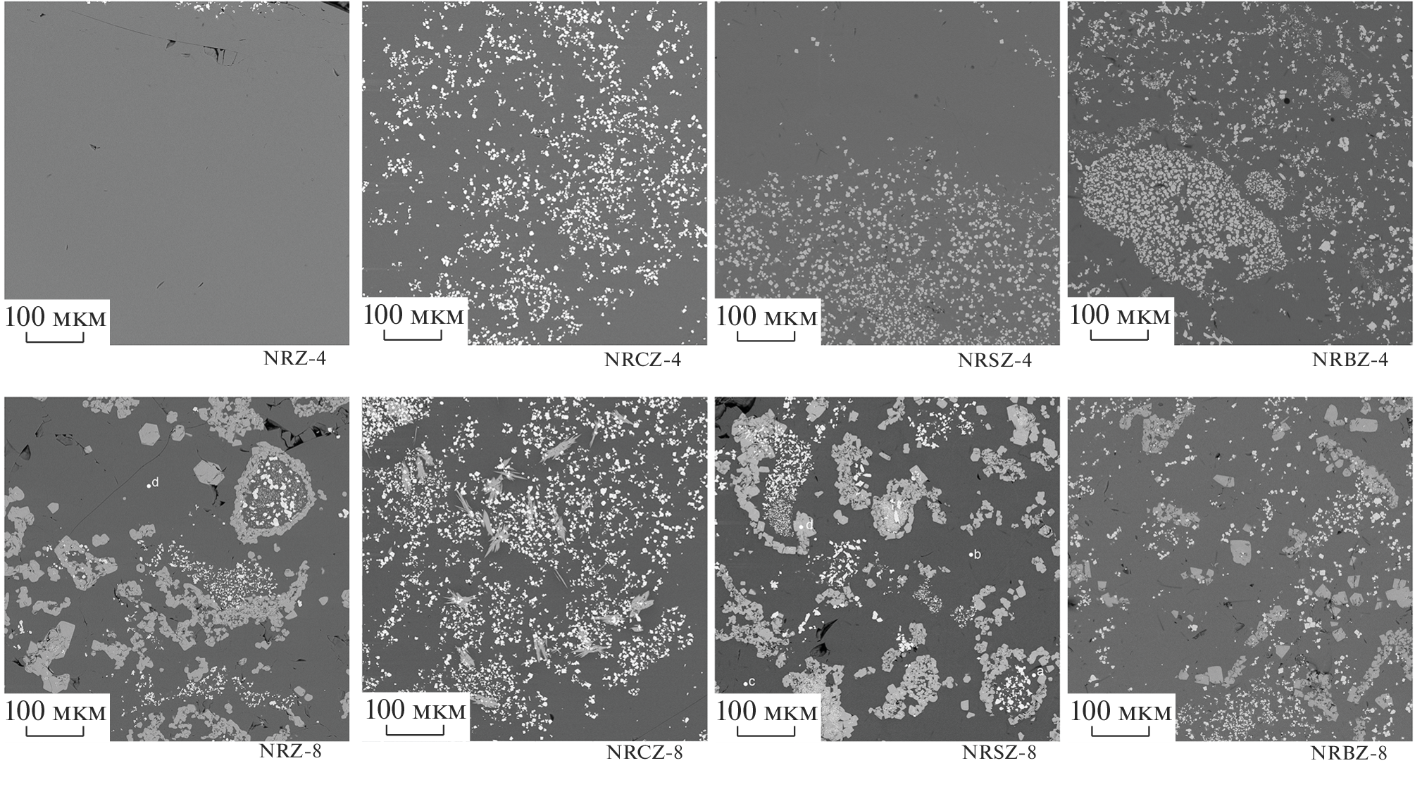 In search of novel waste form materials for vitrifying high-level radioactive waste with various compositions and improving the way in which they are used, we have prepared and investigated waste form materials in the Na2O–Rb2O–SrO(Ba,Ca)–B2O3–SiO2–Al2O3–ZrO2 system. Using electron microscopy, X-ray diffraction, and infrared spectroscopy characterization of samples prepared by rapid cooling of melts containing 3.6–4.5 mol % rubidium, we have demonstrated the formation of a homogeneous glassy material, determined the solubility limit of zirconium in the glass, and identified uniformly distributed baddeleyite crystals, which indicate that the starting melt contained excess zirconium. In samples containing 6.7–8.5 mol % rubidium, we observed the formation of a less homogeneous material with considerable amounts of crystalline zirconium- and rubidium-containing phases. Analysis of the data obtained has made it possible to optimize the percentages of zirconium and rubidium in the composition of radioactive waste in the case of its immobilization via vitrification with the use of waste form materials of the system studied here.