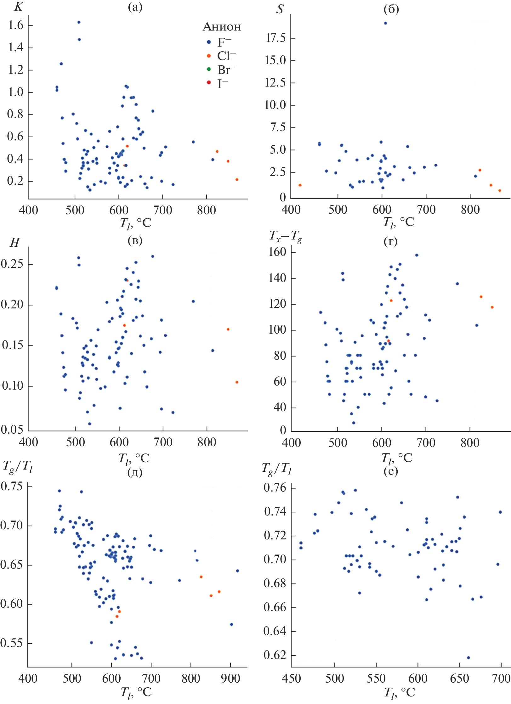 Using content analysis and the Python programming environment, we have found a number of general relationships determining the thermal properties of fluoride and modified fluoride glasses. Their compositions have been classified according to their glass transition temperature (Tg) and the difference between their crystallization onset temperature (Tx) and glass transition temperature: Tx – Tg. The use of Kauzmann’s rule for fluoride glasses, unmodified and modified with other halogens, has been shown to be more reliable if the Tg/Tm ratio is used, compared to the Tg/Tl ratio. We have qualitatively assessed how anion modification influences characteristic temperatures (glass transition temperature Tg, crystallization onset temperature Tx, crystallization peak temperature Tc, melting onset temperature Tm, and liquidus temperature Tl) and crystallization stability criteria (Hruby criterion K, Saad–Poulain criterion S, reduced thermal stability interval H, thermal stability interval Tx – Tg, and reduced glass transition temperatures Tg/Tm and Tg/Tl).
