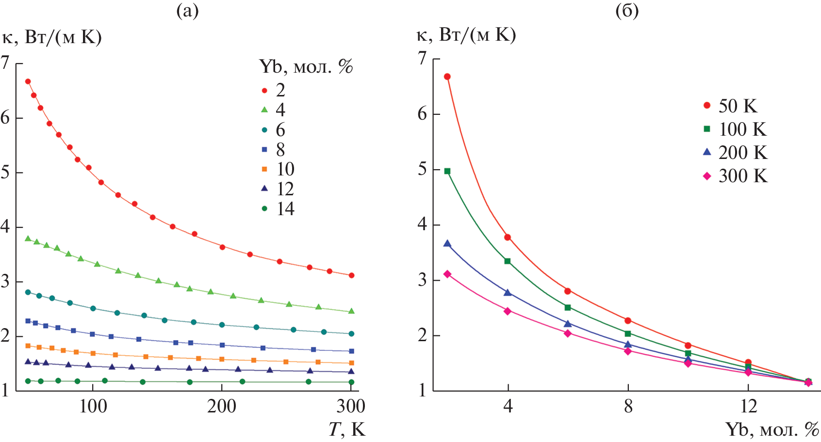 Методом Бриджмена в вакууме с использованием фторирующей атмосферы CF4 выращены монокристаллы твердых растворов Ba1–x–yYbxRyF2+x+y (R = Tm, Ho). Определены закономерности изменения коэффициента теплопроводности в диапазоне 50–300 K и показателя преломления от видимого до ИК-диапазона спектра. Теплопроводность полученных твердых растворов при комнатной температуре уменьшается с 3.39 до 1.18 и с 3.11 до 1.18 Вт/(м К) для R = Tm, Ho соответственно при увеличении концентрации иттербия от 2 до 14 мол. %. При повышении содержания гольмия и тулия в твердых растворах происходит постепенное увеличение показателя преломления, а при увеличении длины волны – его постепенное уменьшение.