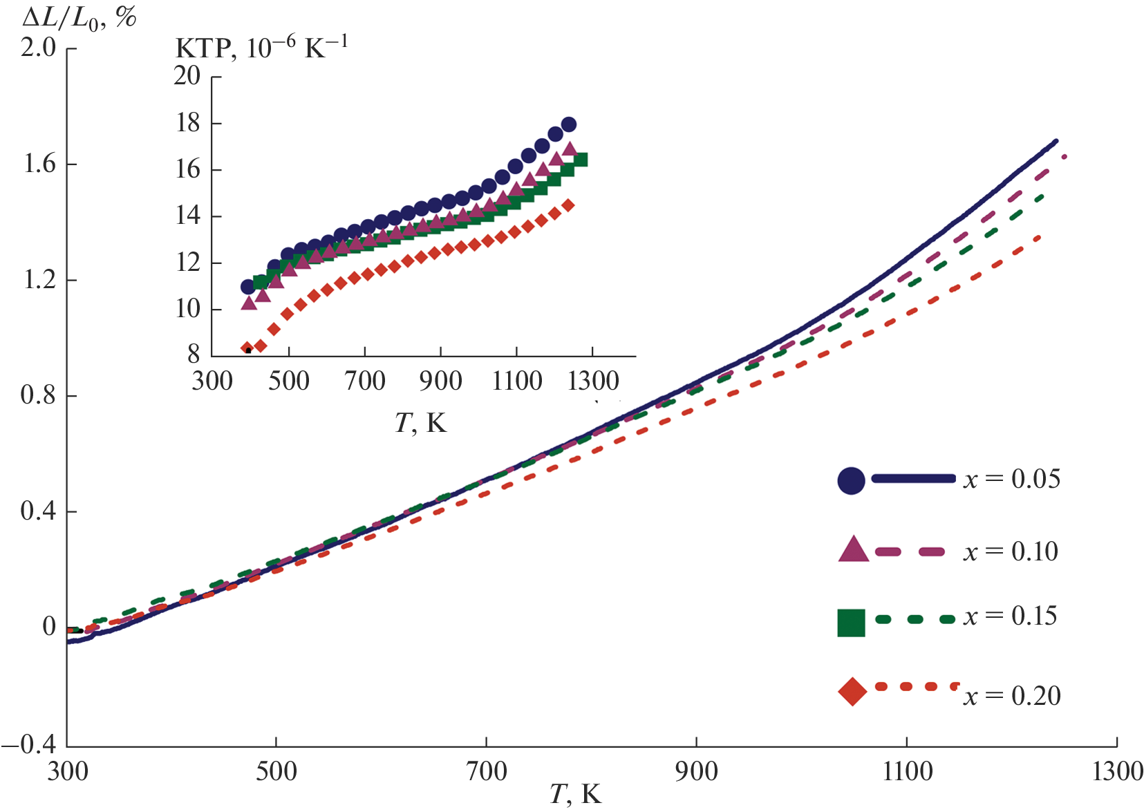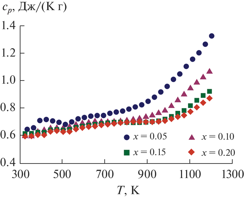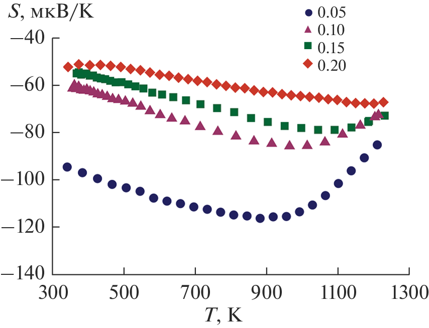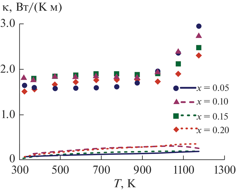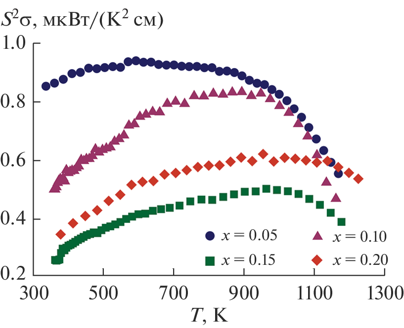 На основе результатов измерений удельной электропроводности (σ), коэффициента Зеебека (S), термического расширения, теплоемкости и температуропроводности на воздухе в температурном диапазоне 300–1200 K определены теплопроводность (κ), фактор мощности (S2σ) и термоэлектрическая добротность (ZT = S2σT/κ) манганитов Ca0.5−xSr0.5LuxMnO3−δ, где x = 0.05, 0.10, 0.15 и 0.20. Установлено, что наибольшие S2σ и ZT имеет состав Ca0.45Sr0.5Lu0.05MnO3−δ, благодаря высоким значениям S и низкой κ.