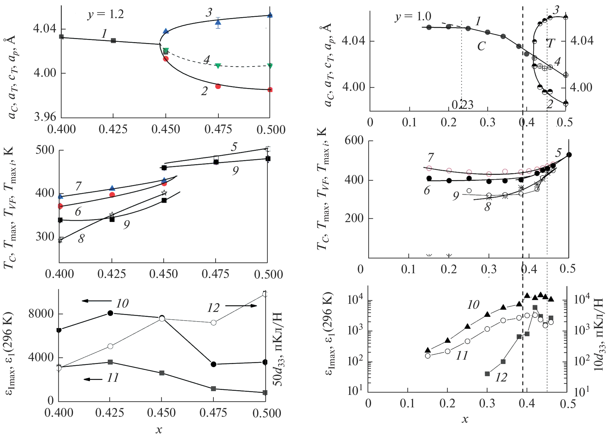 На синтезированных керамических образцах разрезов (1 – 2x)BiScO3·(2 – y)xPbTiO3∙yxPbMg1/3Nb2/3O3 с y = 1.2, 1.0, 0.9 и 0.5 тройной системы BiScO3–PbTiO3–PbMg1/3Nb2/3O3 (BS–PT–PMN) проведены рентгенодифракционные, диэлектрические и пьезоэлектрические исследования, а также изучены токи термостимулированной деполяризации. Установлено, что образцы при (1 – 2x) ≲ 0.5 представляют собой твердые растворы со структурой перовскита, их симметрия с ростом содержания BS повышается от тетрагональной до кубической, в промежуточной области составов (морфотропной области – МО) образцы состоят из смеси твердых растворов разной симметрии. Определены границы МО, получены данные об изменении диэлектрических и пьезоэлектрических свойств твердых растворов с изменением их состава.