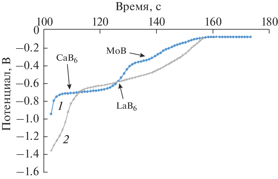 Методами КРС и ИК-спектроскопии исследованы хлоридно-оксидные расплавы, которые использовали для электросинтеза различных боридов кальция и РЗМ. На основании проведенных исследований и анализа литературных данных предложен механизм последовательного перехода твердых оксидов лантаноидов в расплаве хлорида кальция в ионную форму. С помощью хронопотенциометрического метода и циклической вольтамперометрии показано, что образование борида протекает в два этапа. Предложена суммарная реакция, описывающая процесс электрохимического синтеза боридов. Представленный механизм не противоречит законам химической термодинамики и позволяет описать предложенные обменные и электродные реакции.