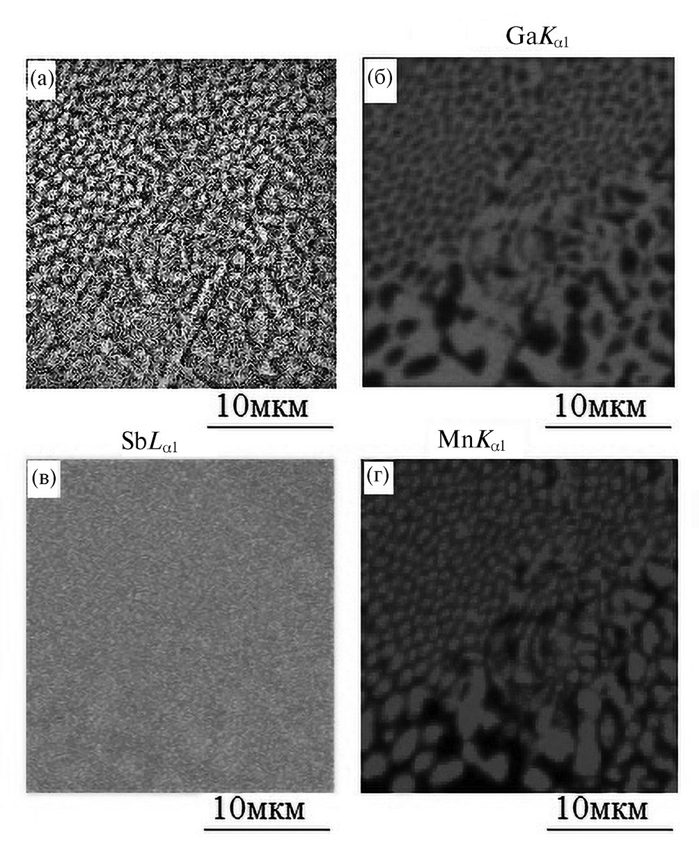 Рис. 4. Микроструктура закаленного образца состава 59 мол. % GaSb–41 мол. % MnSb с картированием элементного состава