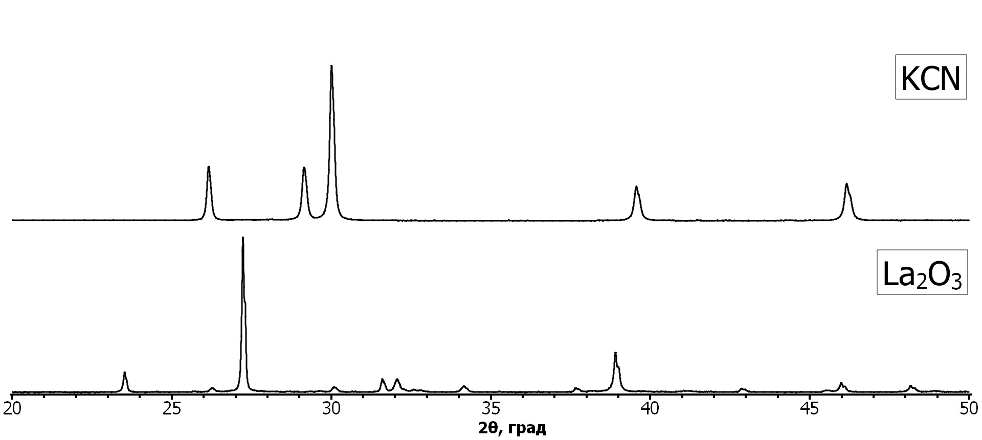 Рис. 1. Дифрактограммы оксида лантана и цианида калия, используемых в синтезе (все рефлексы принадлежат заявленным фазам)