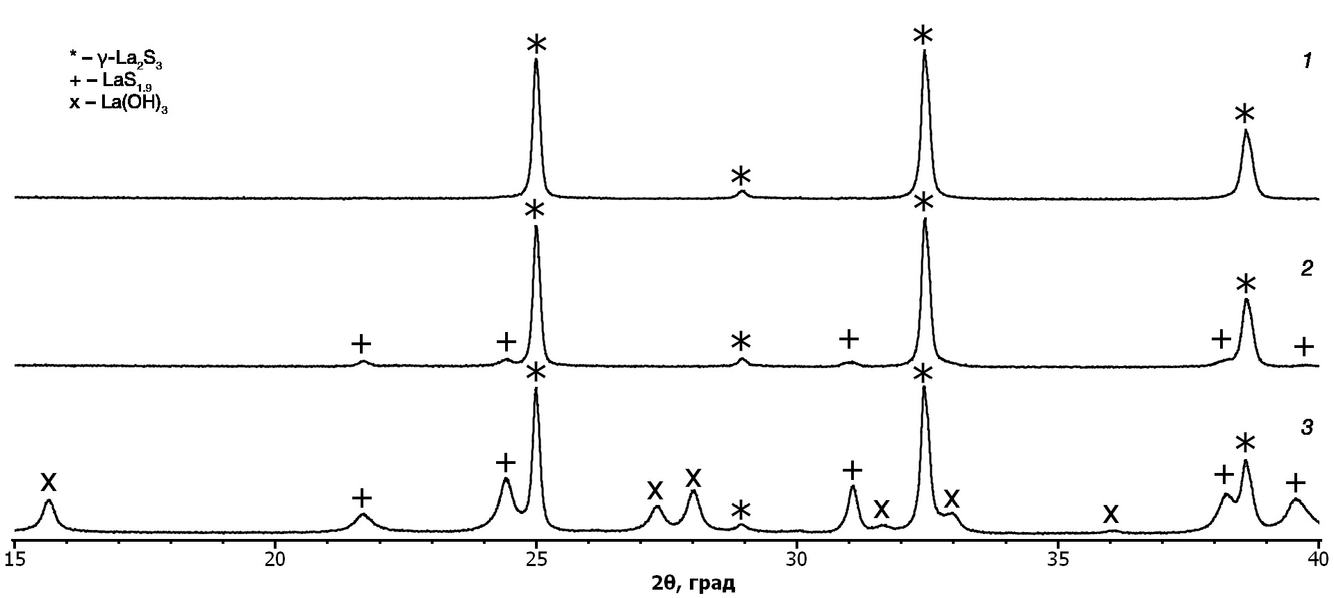 Рис. 2. Дифрактограммы полученных образцов сульфида лантана: 1 – в синтезе с добавлением 4 порций KCN по 71 мг, 2 – в синтезе с добавлением 4 порций KCN по 65 мг, 3 – без добавления цианида